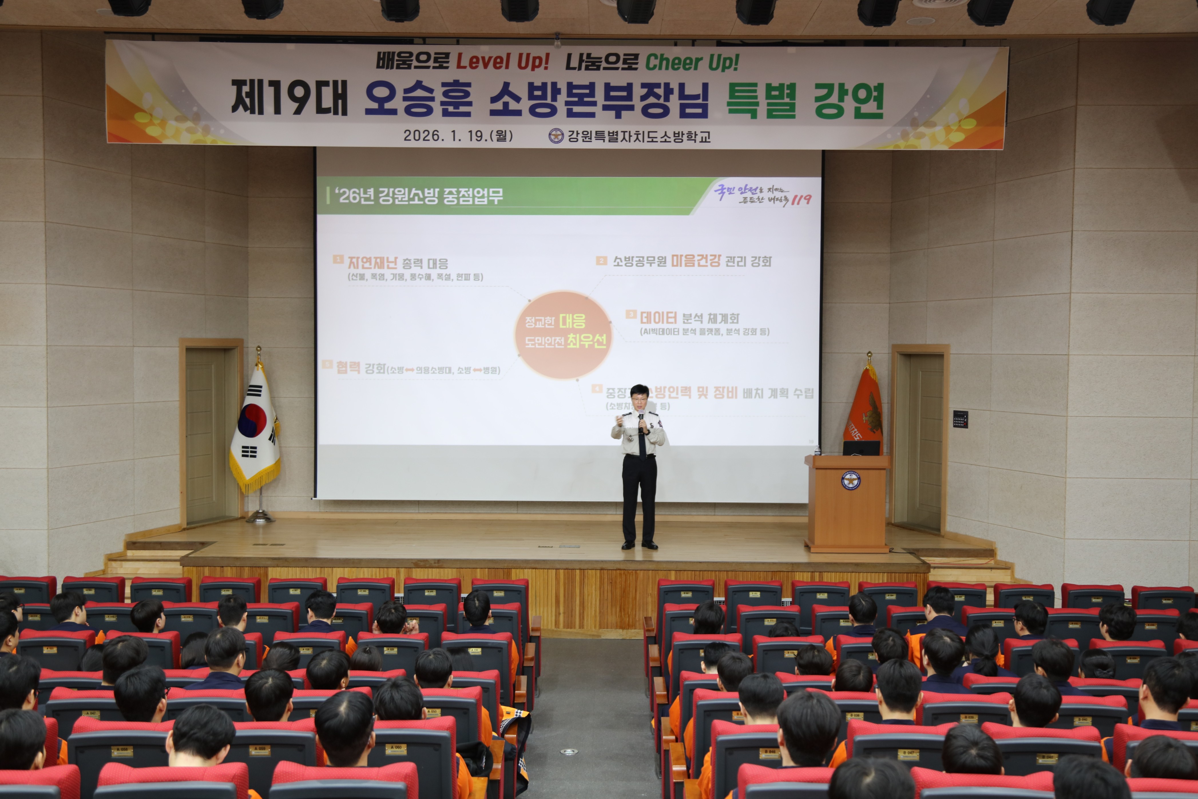 ○ 오승훈 강원특별자치도 소방본부장은 19일 오전 10시 강원소방학교에서 제42기 신임소방사반 교육생들을 대상으로 특별 강연을 진행했다.
