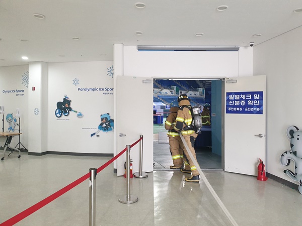 이번 훈련은 아이스아레나 경기장에서 진행되었으며 소방 14명, 관계인 10명 등 총 25명이 훈련에 참가하였다.