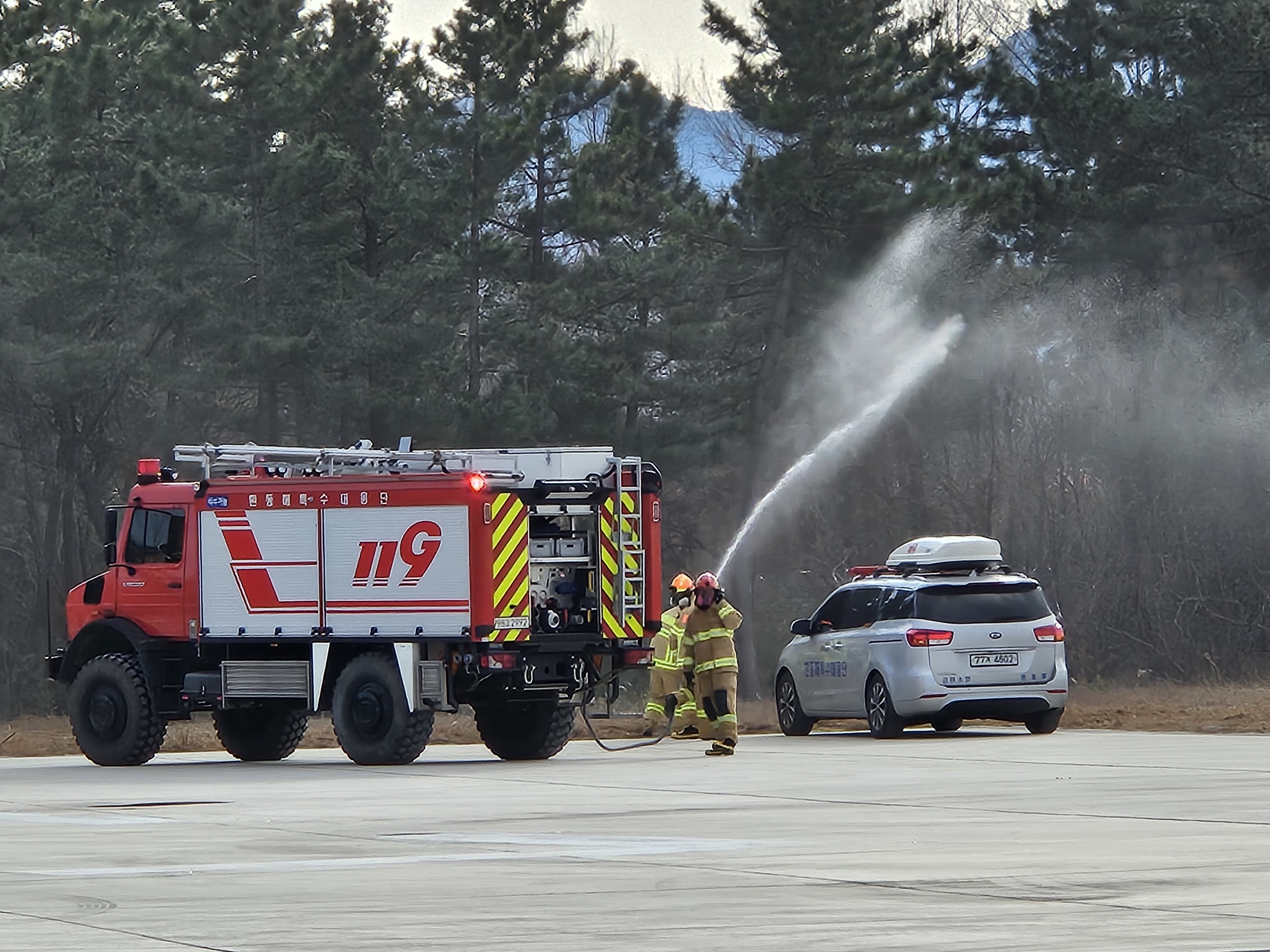 금일 소방청 및 강원특별자치도 소방본부에서 주관하는 재난대비 소방헬기 통합지휘 훈련이 공군 18전투비행단 인근에서 시행됐습니다.