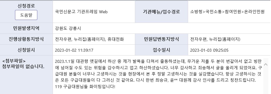 119구조대 윤혁진, 최승규 대원의 구조활동에 대한 감사글이 국민신문고로 접수되었기에