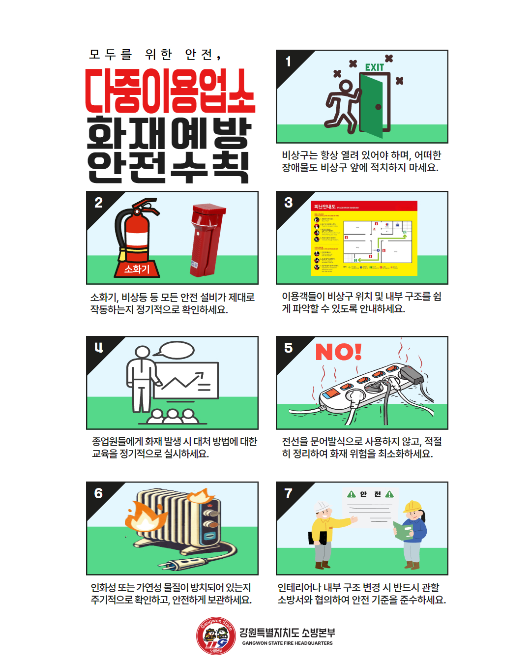 비상구 앞 물건 치우기, 방화문 닫아두기, 피난안내도 비치하기