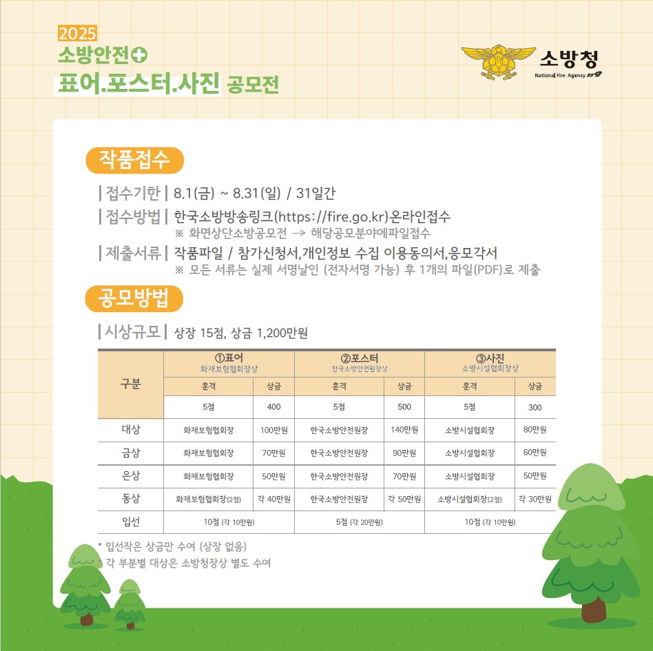 소방청에서 국민 참여로 소방안전에 대한 경각심 고취하고자「2025년 소방안전 표어·포스터·사진 공모전」을 아래와 같이 추진하오니, 많은 관심 부탁드립니다.