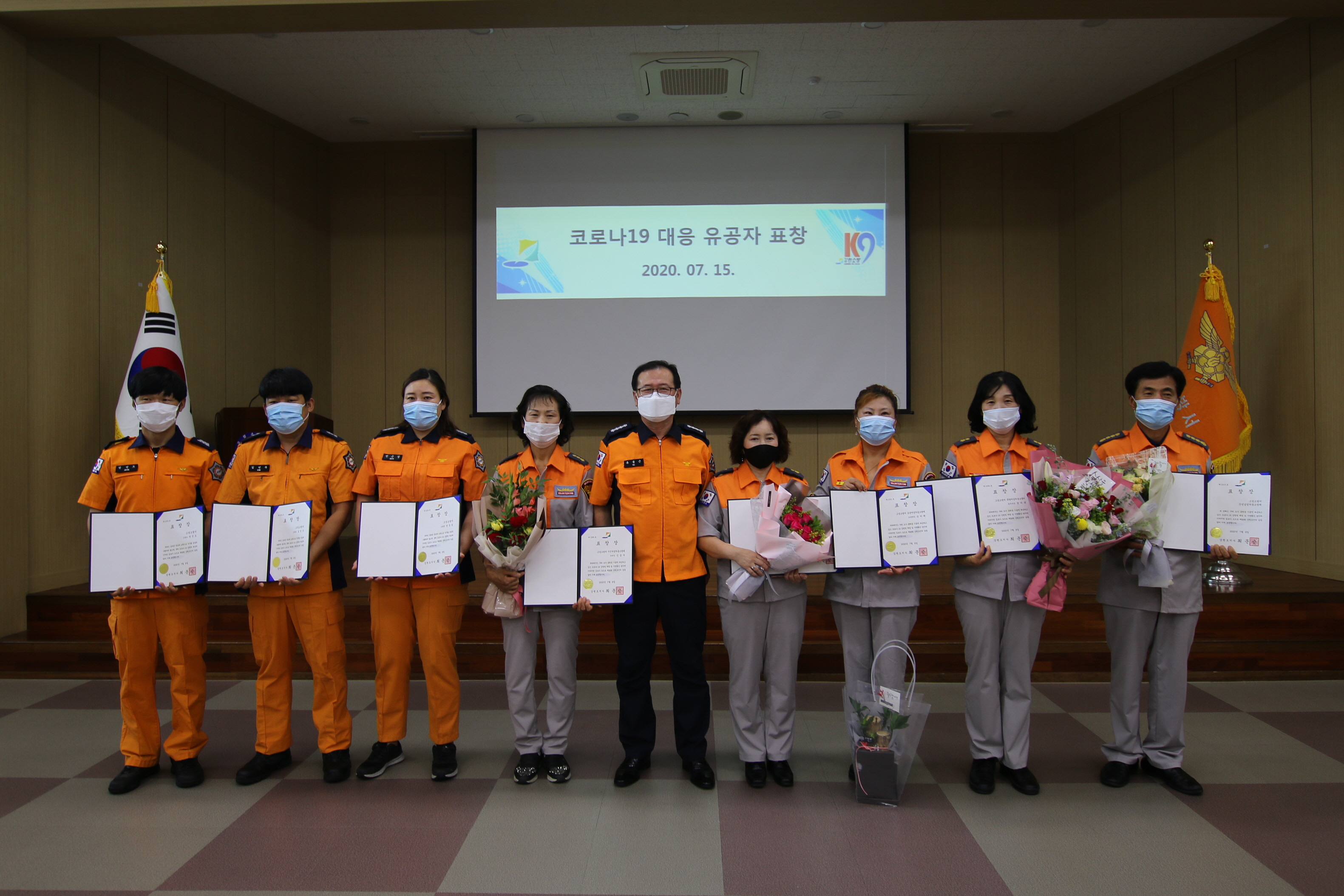 감염 확산방지에 기여한 의용소방대원 3명(신금자, 정미옥, 손미예), 간성남성의용소방대에 대한 표창장 배부.