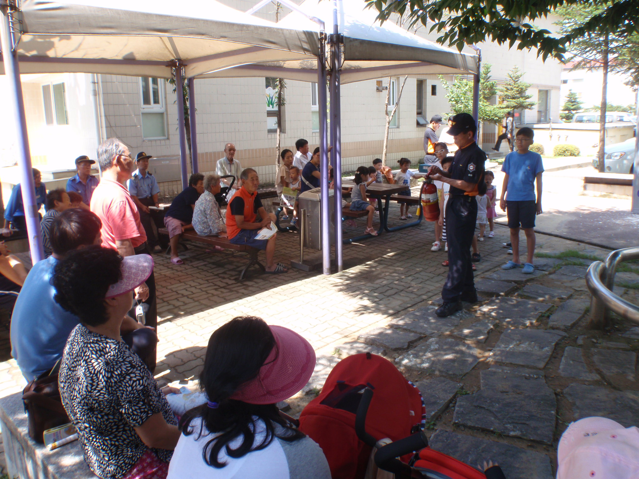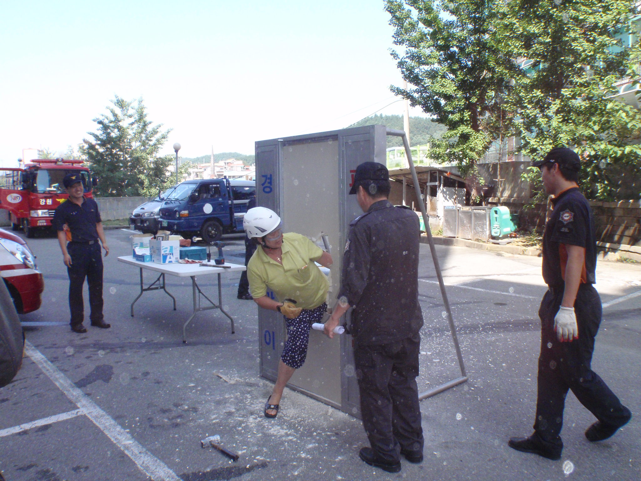 홍천소방서장(김진봉)은 2011. 8. 4(금) 10:00 ~ 홍천읍 갈막곡리에 소재한 미진1차, 미진2차, 주공1차아파트에서 직원 및 입주민(체험참가자) 등 100여명이 참여한 가운데 자체 제작한 경량칸막이 파괴 및 탈출 시연회 및 소화기 사용법 교육을 실시하였다.