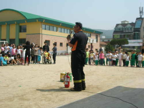 방수포를 이용하여 고층건물 화재진압 훈련을 실시하였으며, 아이들과 함께 소화기 사용법