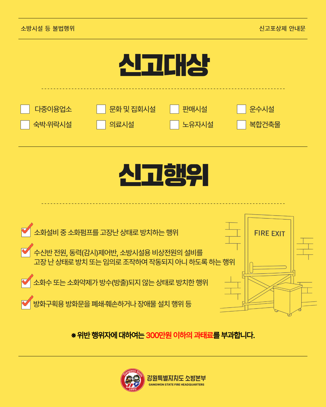 주요 신고 대상은 ▲비상구를 폐쇄하거나 잠그는 행위 ▲비상구 앞이나 피난통로에 물건을 적치하는 행위 ▲소방시설의 고장을 방치하는 행위 ▲방화문을 임의로 훼손하거나 고정하는 행위 등으로, 이러한 행위는 화재 발생 시 대피에 지장을 주는 불법행위에 해당한다.