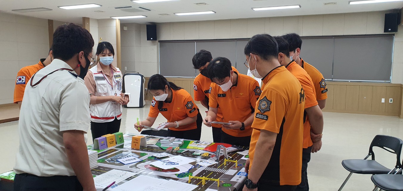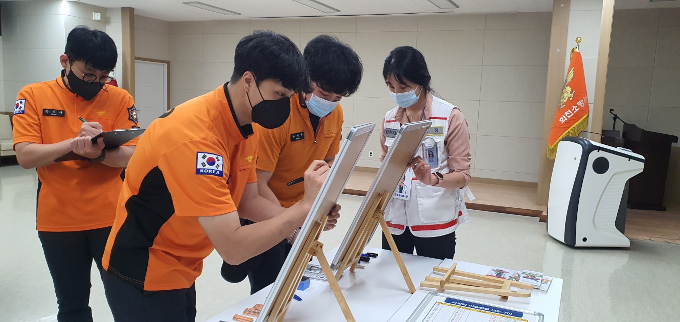 □ 이번 훈련은 코로나19 예방 및 생활 속 거리두기 지침을 준수하여 진행됐다. 훈련은 국립 중앙의료원 전문강사를 초빙하여 가상의 다수 환자 발생 시나리오 순서대로 진행됐으며, 도상 훈련키트 등을 활용한 다양한 재난 사고대비 중증도 분류 및 응급처치 능력 향상에 목적을 가지고 실시했다.