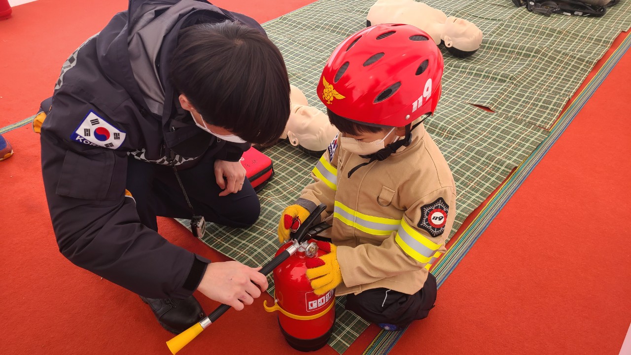 '2023 얼음나라 화천산천어축제' 소소심 소방안전체험장 소방홍보부스에서 관광객들에게 소화기 사용법, 심폐소생술 교육 등(주택용소방시설 설치하기 홍보)을 운영하고 있습니다.