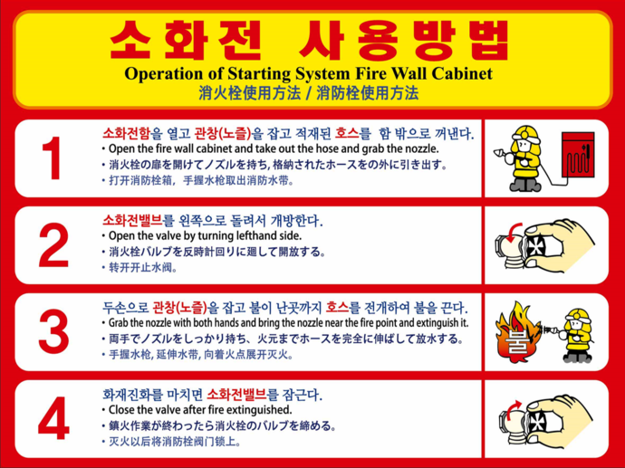 앞으로는 착공되는 건물들의 소화전함 내부ㆍ외부에 사용설명서를 붙이고 외국어와 함께 시각적인 그림도 첨부해야 합니다