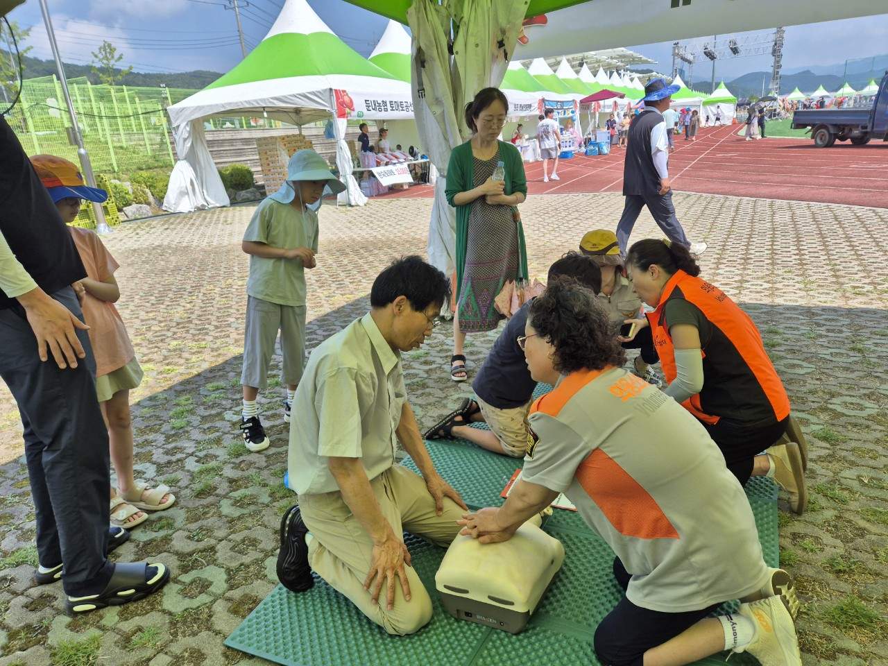 둔내 남,녀 의용소방대에서는 심폐소생술 교육과 소화기 사용법을 방문객 대상으로 교육을 실시하였습니다.