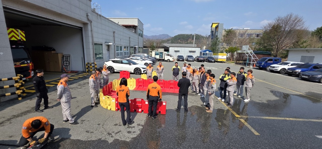 횡성수난전문의용소방대, 4월 정기교육서 ‘전기차 화재 진압장비’ 집중 교육 실시