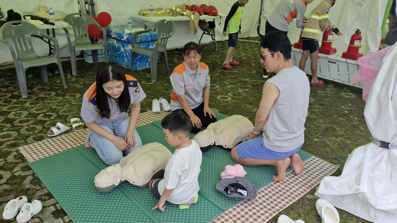 이번 홍보 부스에서는 물소화기 사용 체험과 심폐소생술(CPR) 교육을 통해 축제장을 찾은 주민과 관광객들에게 화재 예방과 응급처치의 중요성을 알렸고