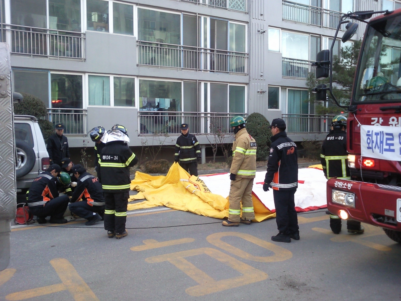 바람이 많이 불어 안전매트가 출렁 출렁 거렸지만 센터와 구조대가 함께 안전매트를 신속하게 전개하여 만일의 경우를 대비하였습니다.