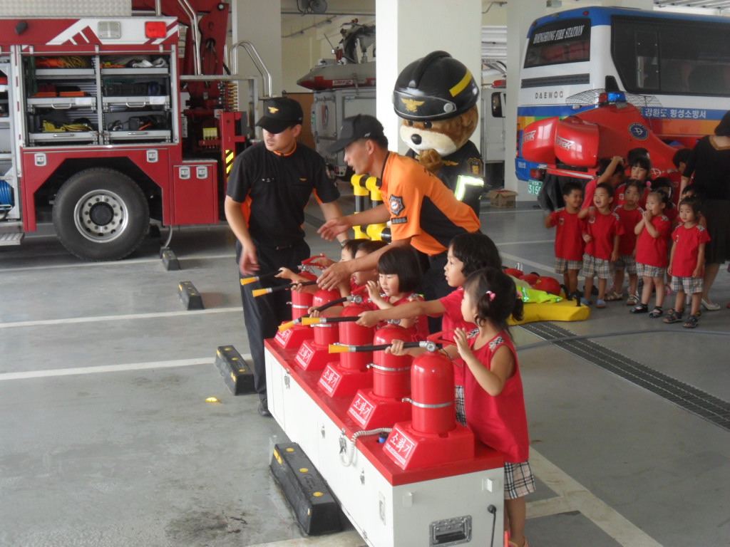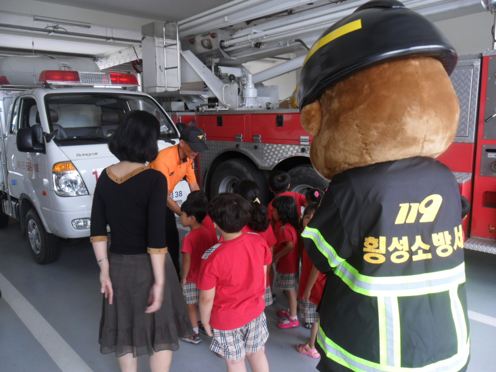 횡성소방서(서장 조근희) 횡성119안전센터에서는 2011. 08. 26(금) 11:00 횡성군 청일면에 위치한 샬롬어린이집과 강림면에 위치한 에던어린이집 원생들 60여명을 초대하여 물소화기 방수 및 구조,구급, 진압장비 체험 등을 실시하였습니다.