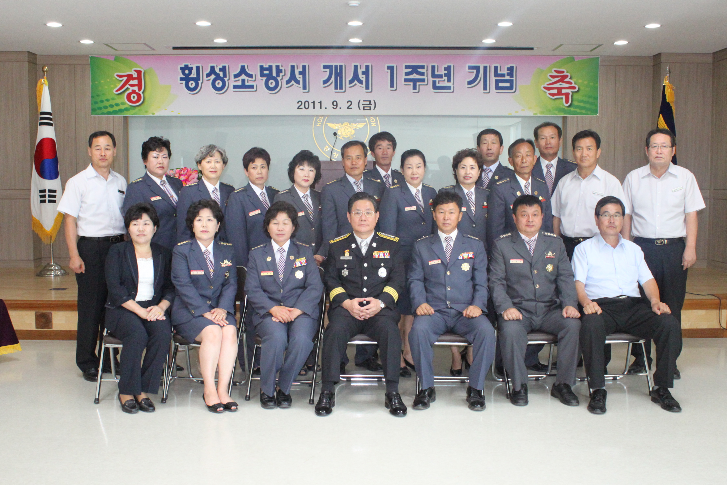 횡성소방서(서장 조근희)는 9월2일 본서 대회의실에서 개서 1주년 기념행사를 실시했다. 횡성소방서 개서 1주년을 맞이하여 직원들의 사기진작 및 그동안 노고를 치하하는 자리였으며, 19개 읍면 의용소방대장도 참석하여 자리를 빛냈다.