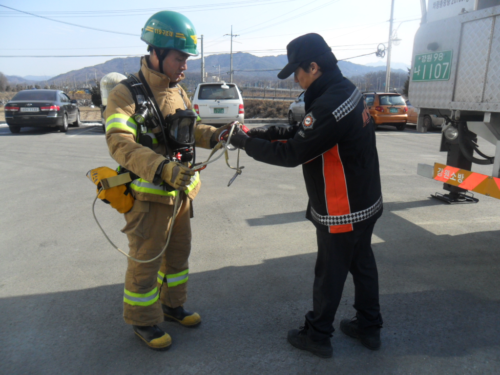 횡성소방서(서장 조근희) 횡성 119안전센터에서는 2월13일(월) 이번에 새로 보강된 긴급탈출세트를 이용하여 119구조대와 함께 합동 훈련을 실시하였다. 화재현장에서 대원의 안전이 더욱 우선시 될 수 있도록 보강된 새로운 장비로 긴급시에는 더욱 안전하게 탈출하며 조금 더 효율적인 현장활동이 될 것으로 기대된다.