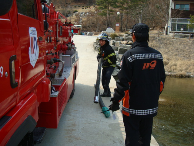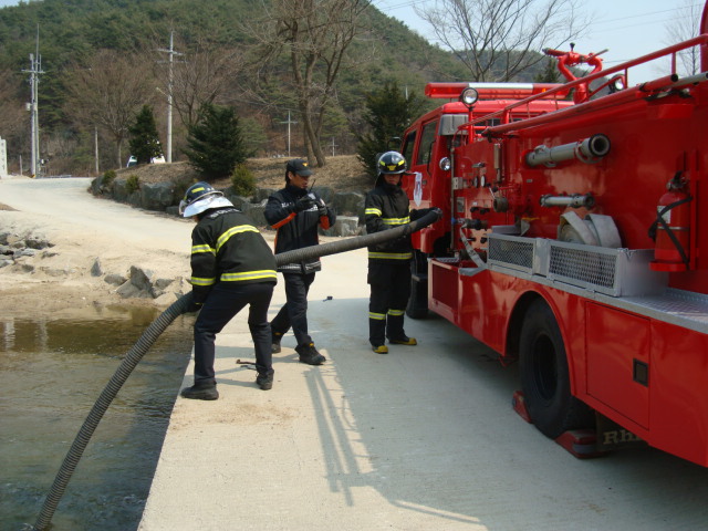 횡성소방서(서장 조근희) 2012.03.27. 우천119안전센터에서는 흡수조작능력 숙달을 위해 하천에서 펌프차를 이용한 흡수훈련을 실시하였다.