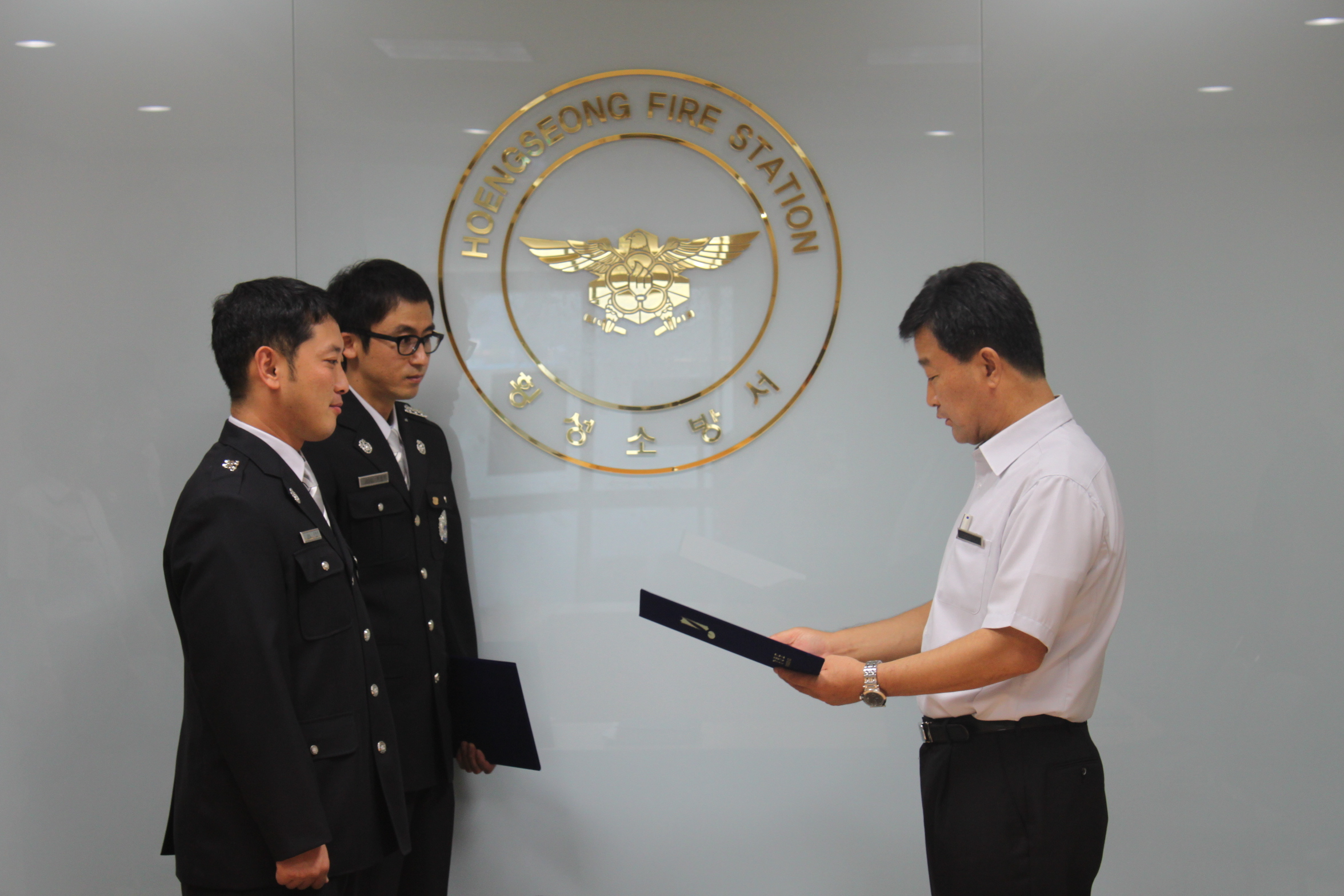 횡성소방서(서장 정은철)는 지난 20112. 7.11. 횡성군 갑천면 병지방리 금계나라 민박집에서 발생한 심정지 응급환자에게 심폐소생술(CPR)을 시행하여 귀중한 생명을 구한 소방교 임대진, 소방사 강래춘 구급대원에 대한 공로 인정 Heart Saver 증서 및 뱃지를 수여했다.