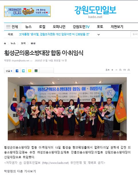 횡성소방서는 13일 오전 10시 30분 횡성읍 향교웨딩홀에서 갑천면 남성의용소방대장, 우천면 여성의용소방대장, 안흥면 남성의용소방대장, 강림 남성의용소방대장 이·취임식을 개최했다.