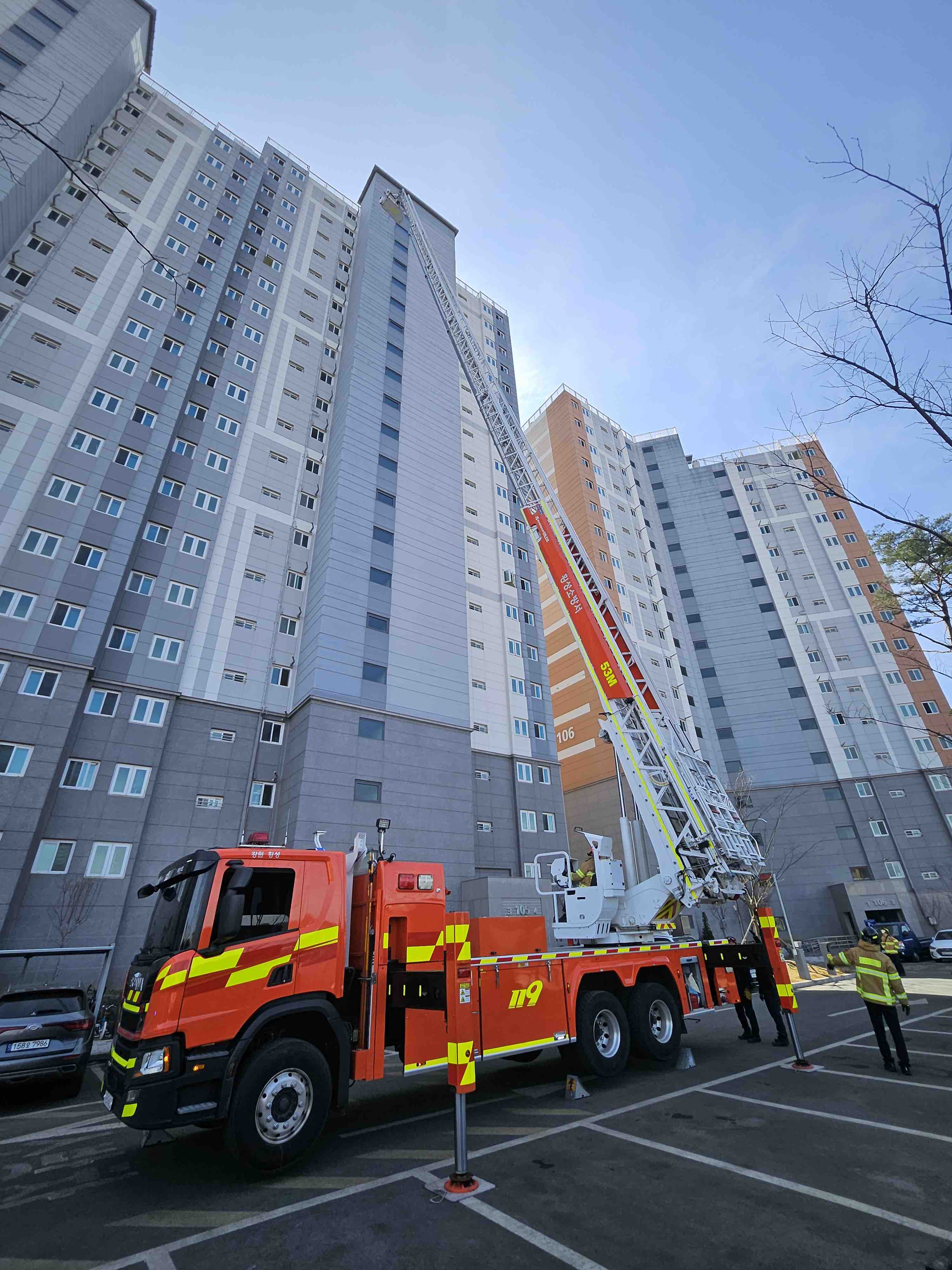 훈련은 ▲피난대피훈련 ▲소방차량 배치 및 지휘체계훈련(소방차 부서 위치 선정) ▲지하주차장 무선통신망 확립 ▲고가사다리차 전개 및 에어매트 훈련 등으로 진행됐다.