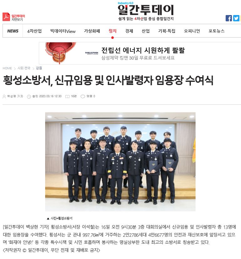 | 2423 | 횡성소방서 신규 임용, 인사발령자 임용장 수여식 | 횡성홍보 | 2020-03-16 | 1099 | |