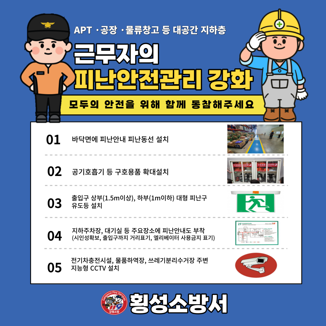 모두의 안전을 위해 대공간 지하층에서 근무자의 피난안전관리 강화에 동참하여 주세요!