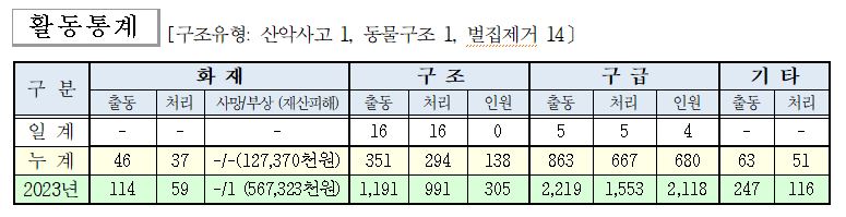 ○ 구조 16건(산악사고 1, 동물구조 1, 벌집제거 14)