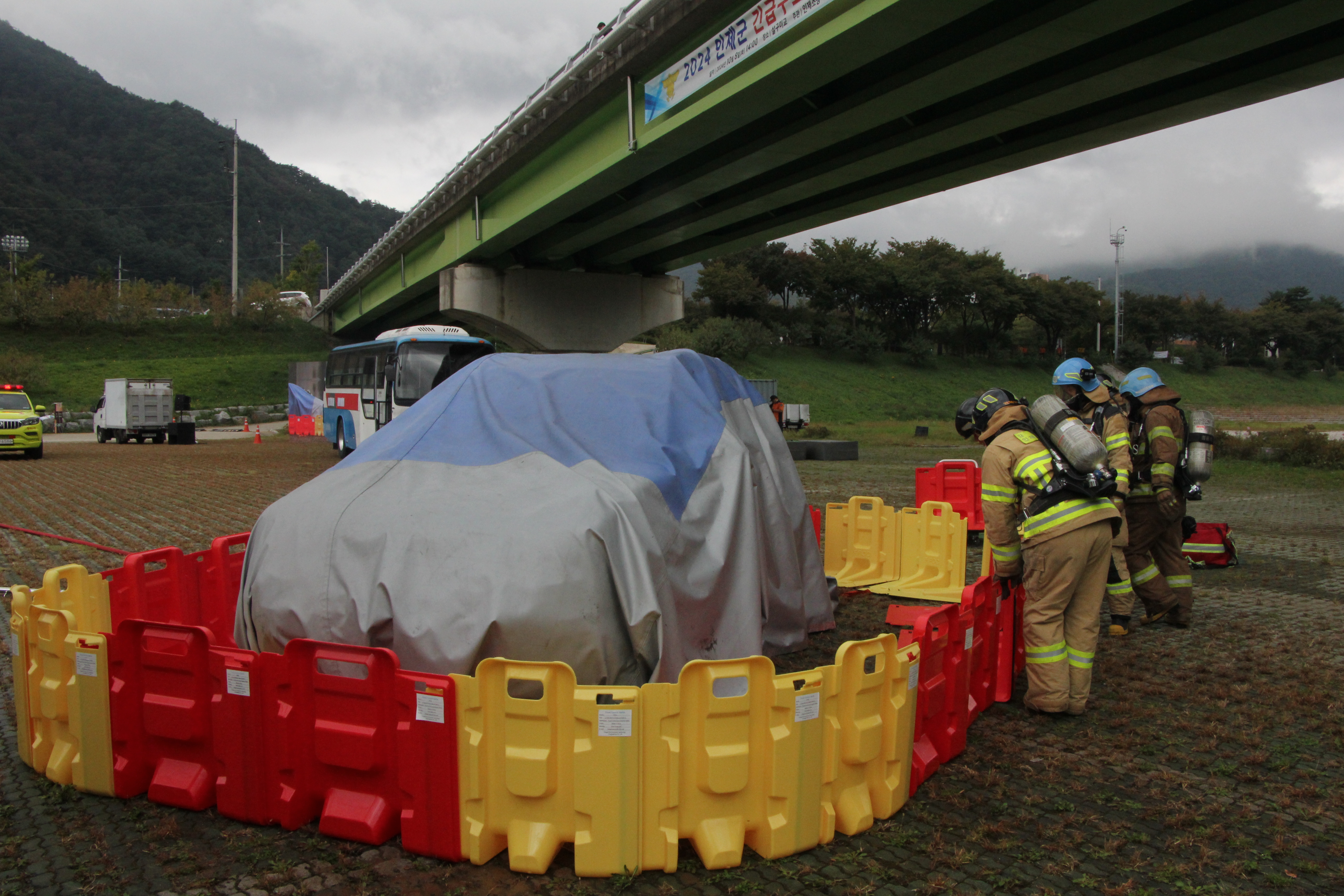 금일 훈련은 교량 위 버스와 승용차량이 충돌 후 추락한 상황을 가정하여 진행하였으며,