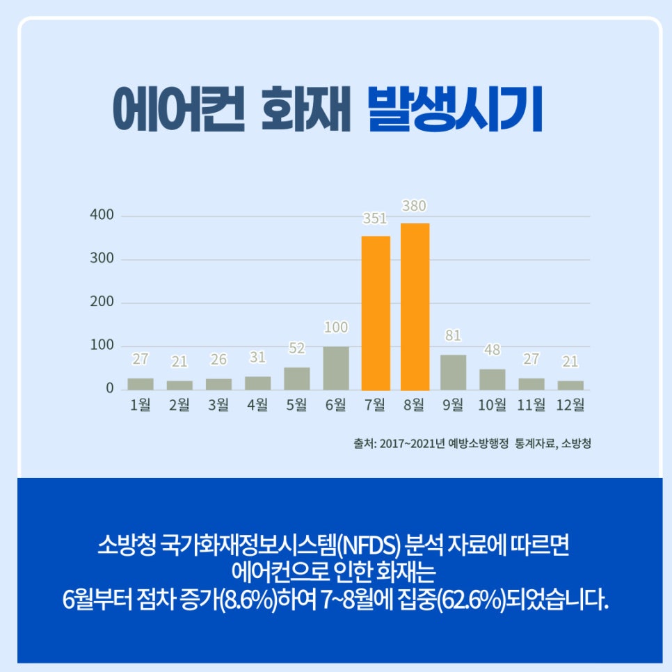 7월~8월 여름철 냉방기기 사용 급증으로 인해 에어컨 등 전기화재 발생이 증가하고 있습니다.