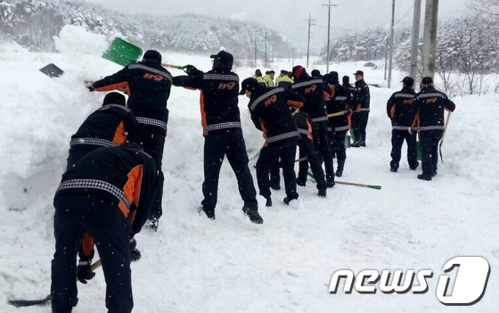 인제군 공무원과 자원봉사센터관계자, 자율방재단원 등 총 190여명은 폭설로 고립된 속초지역 주민의 통행 재개를 위해 제설작업을 보탰다.