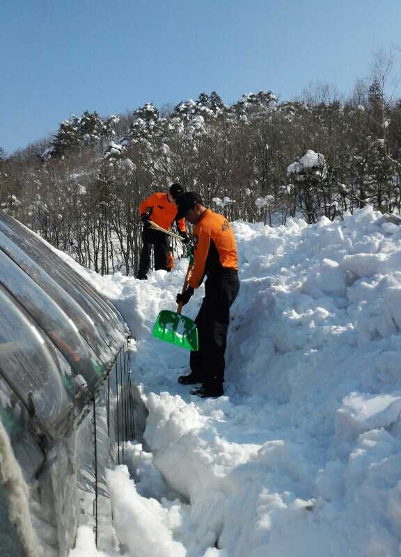 2014년 2월 15일 인제소방서(서장:김용락) 공무원과 의용소방대 60여명이 폭설로 뒤덮인 고성군 간성읍 탑동마을에서 제설․ 복구작업을 하고 있다.