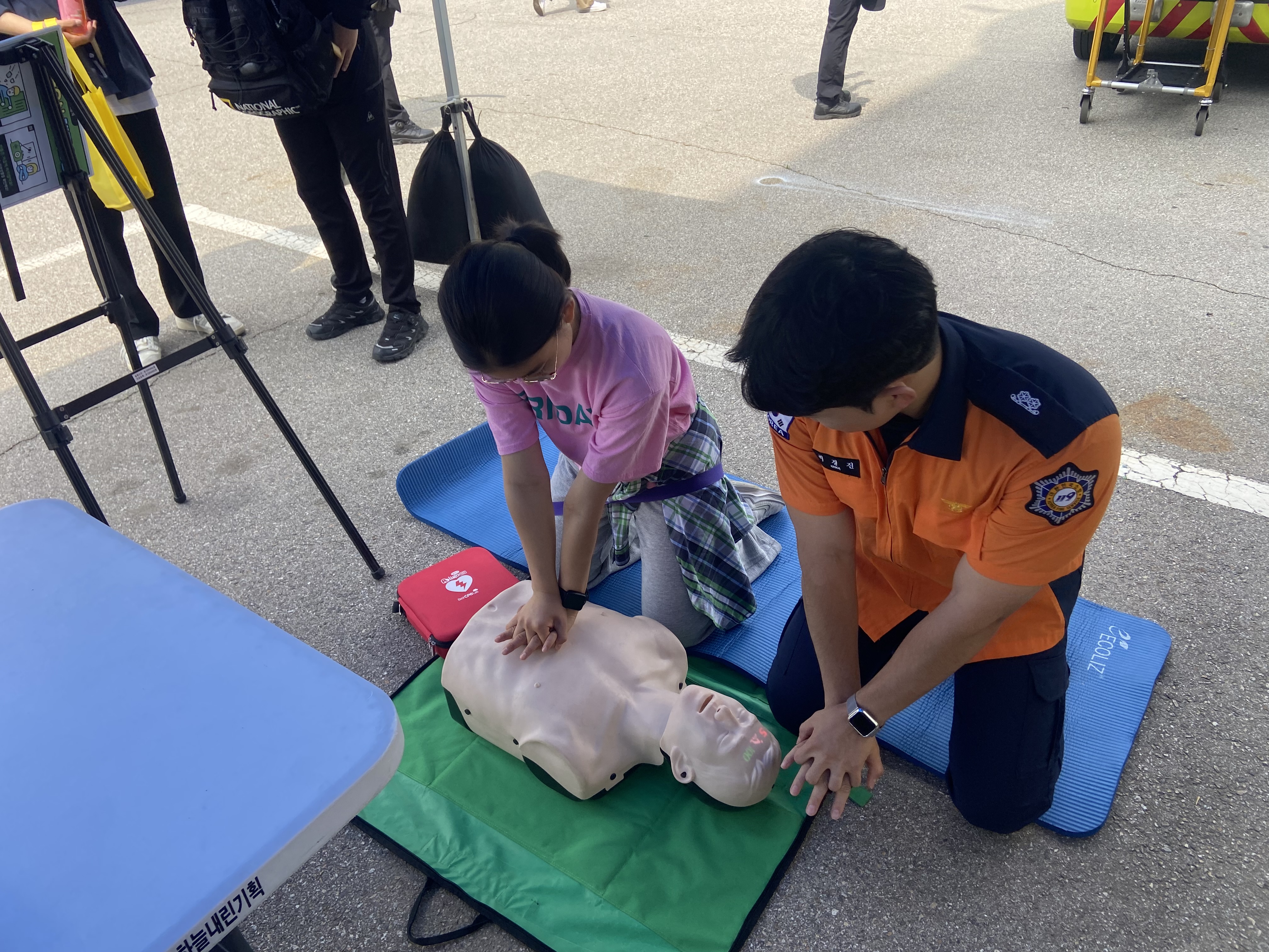 주요 내용은 ▲심폐소생술 방법 안내 ▲자동제세동기(AED) 사용법 안내 ▲방화복 착용 및 구급차 체험 ▲진로상담 ▲지진 발생 시 행동요령 홍보 ▲벌 쏘임 대처 및 예방법 홍보 등이다.