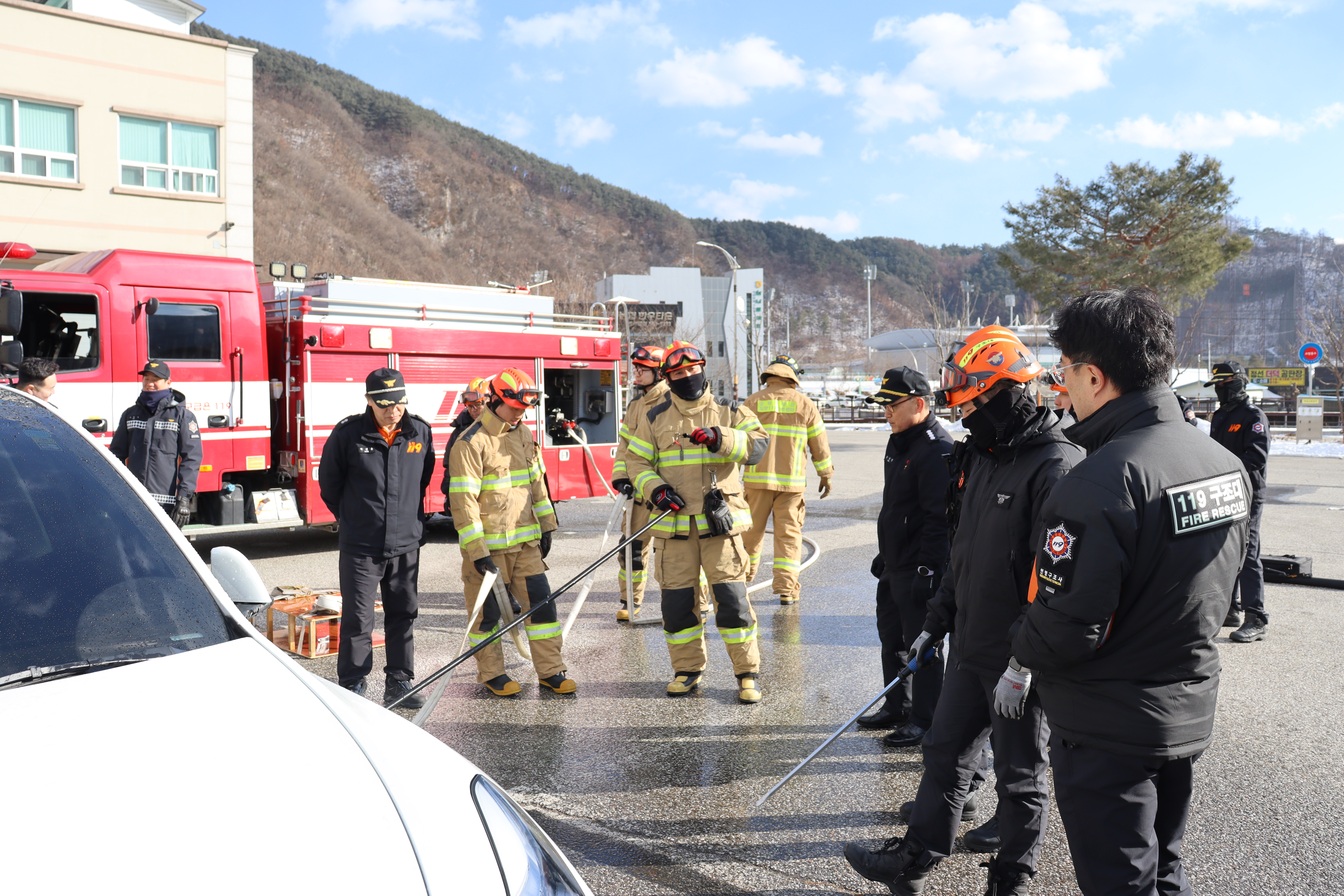 2025-01-08. 정선소방서, 'EV-드릴랜스' 활용 전기차 화재진압 훈련 실시