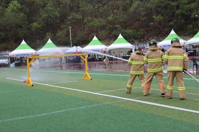 ➤ 대회에 참가한 각 읍 · 면 의용소방대 18개대 500여 명의 대원들은 4인조법과 소방호스 전개 및 회수, 심폐소생술 등 2개 분야 3개 종목에서 시연을 펼쳤다. 이어진 체육행사와 장기자랑을 통해 상호 간의 우호를 증진하고 화합하는 시간도 가졌다.