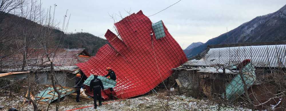 강풍으로 철제지붕이 날아가 간이 전봇대에 걸려있는 상황으로 정선소방서는 인원9명, 장비2대를 이용하였다, 한국전력 유관기관에 통보하여 전기통하지 않음을 확인 후 절단 및 지붕 해체 작업을 실시하여 현장안전조치 완료하였다.