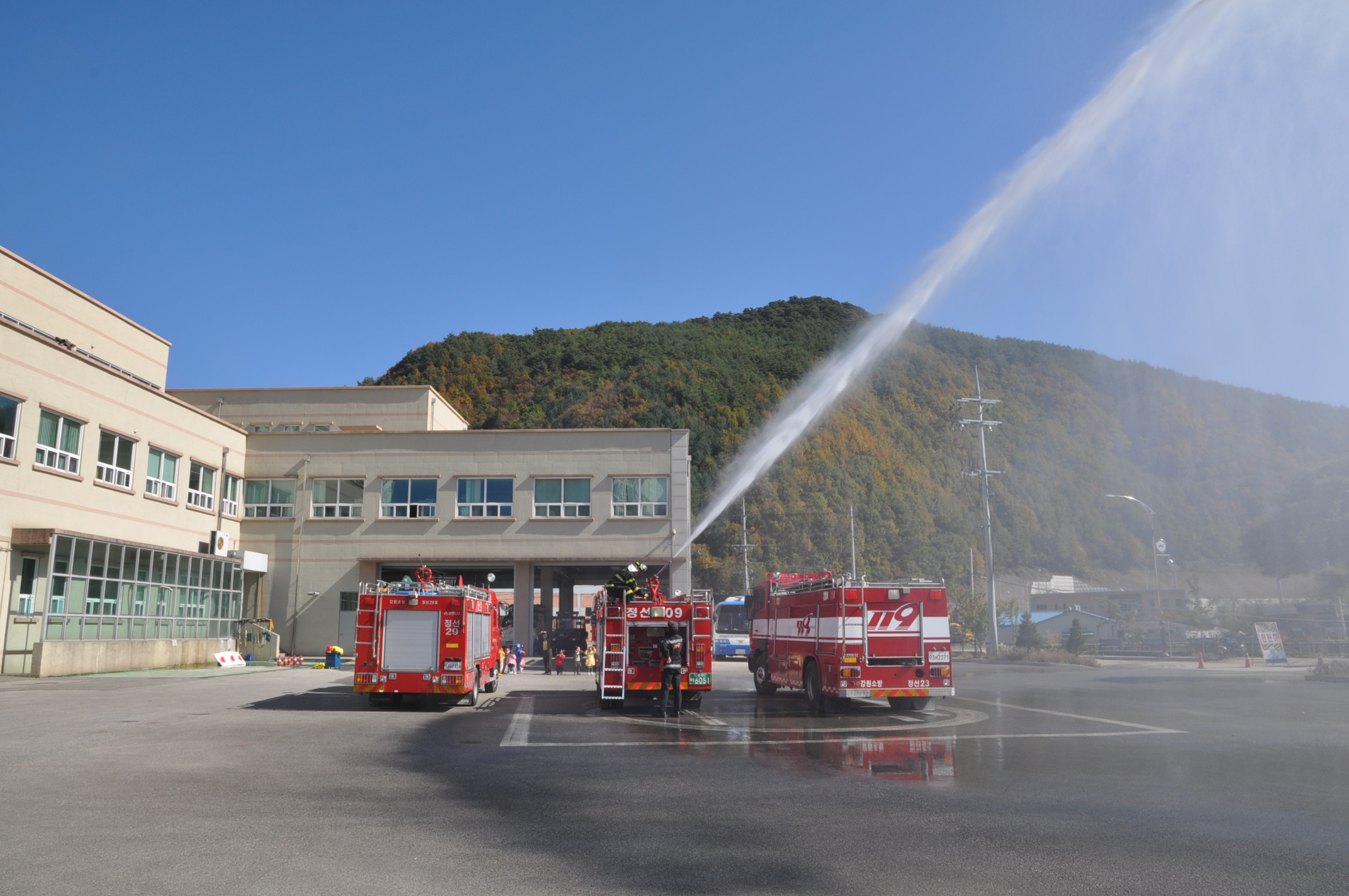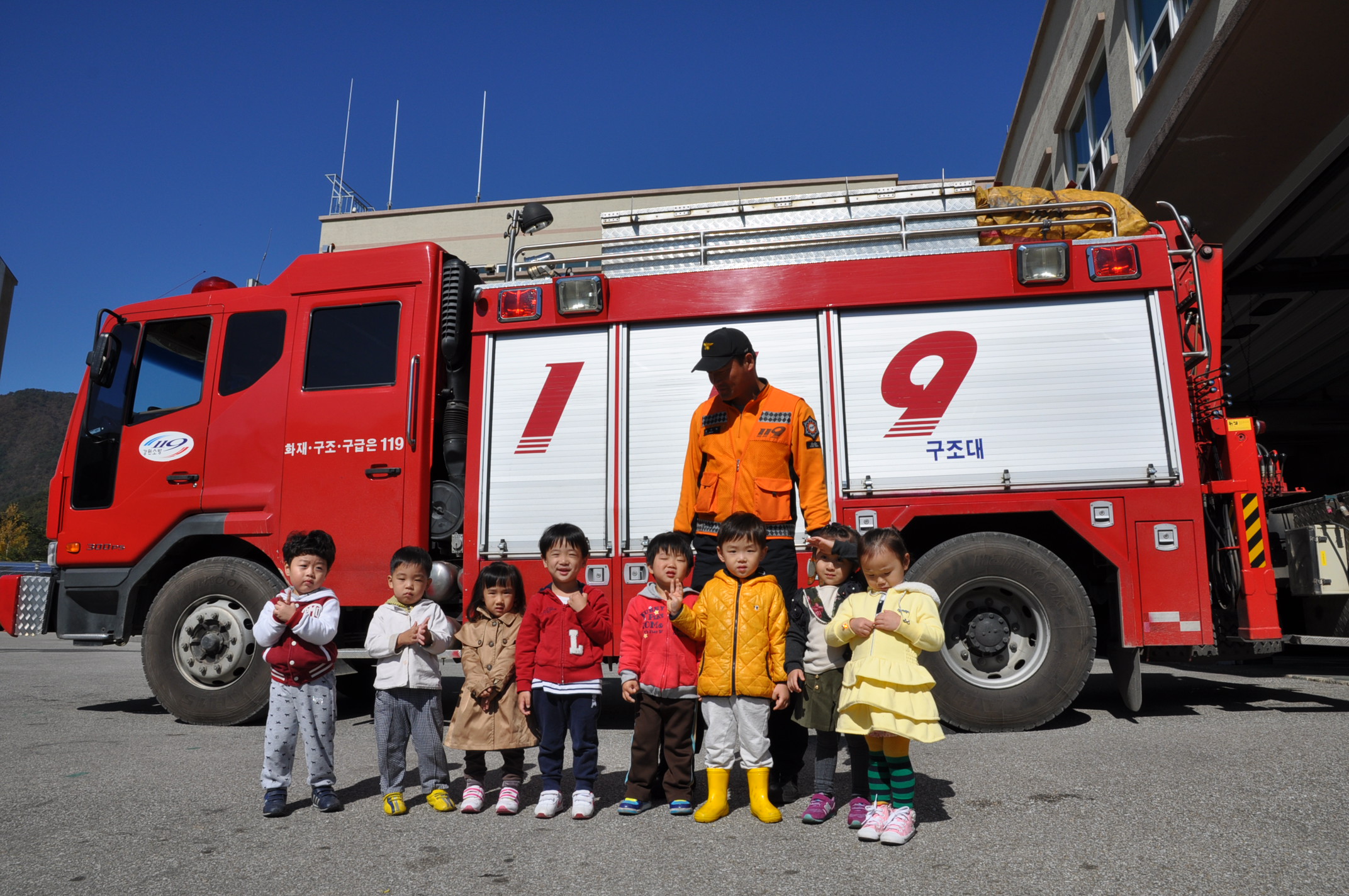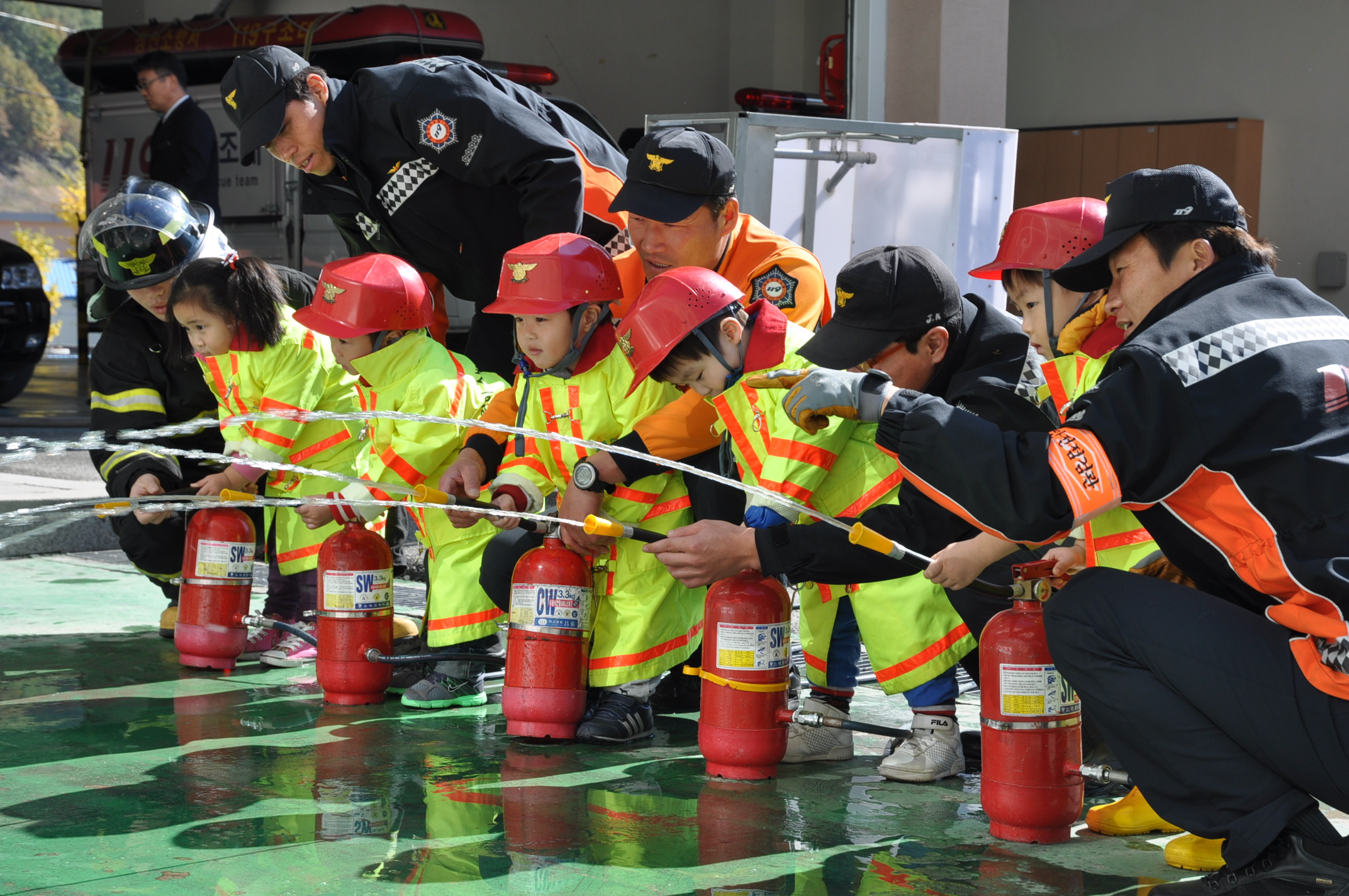 정선소방서(서장 박창진) 정선119안전센터는 2011.10.19(수) 새빛어린이집에 다니는 어린이 18명을 대상으로 물소화기 체험,소방차량 소개 및 기념촬영을 실시하였습니다.