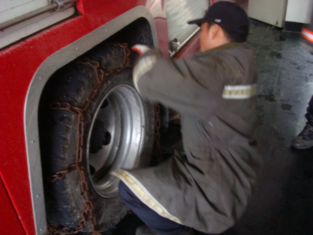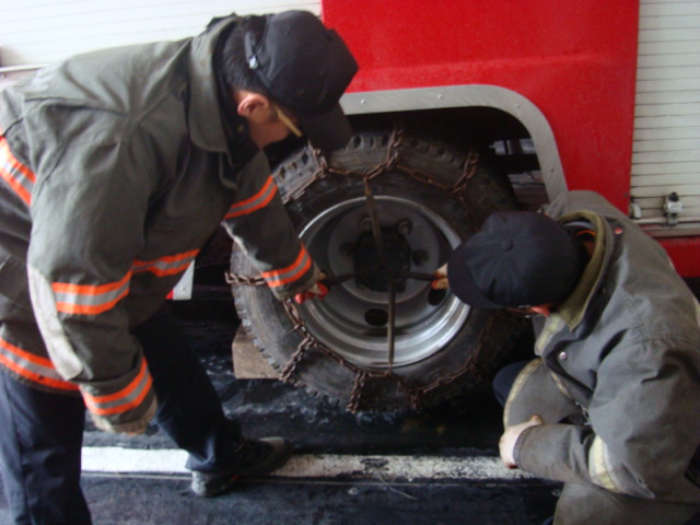 정선소방서(서장 박창진) 폭설대비 펌프차량 체인장착 요령 숙달훈련으로 폭설시에도 신속한 출동을 할 수 있도록 훈련을 실시함.