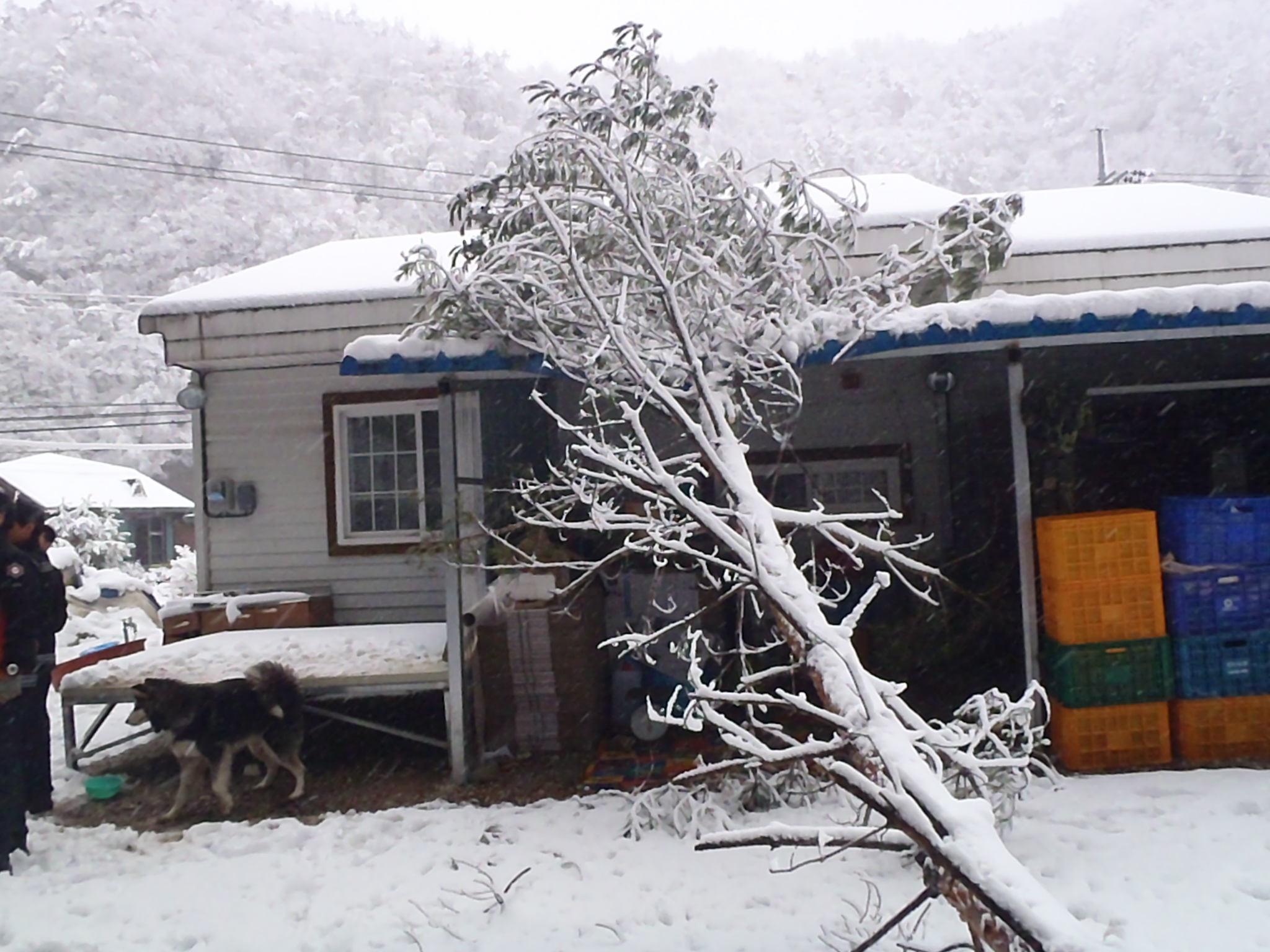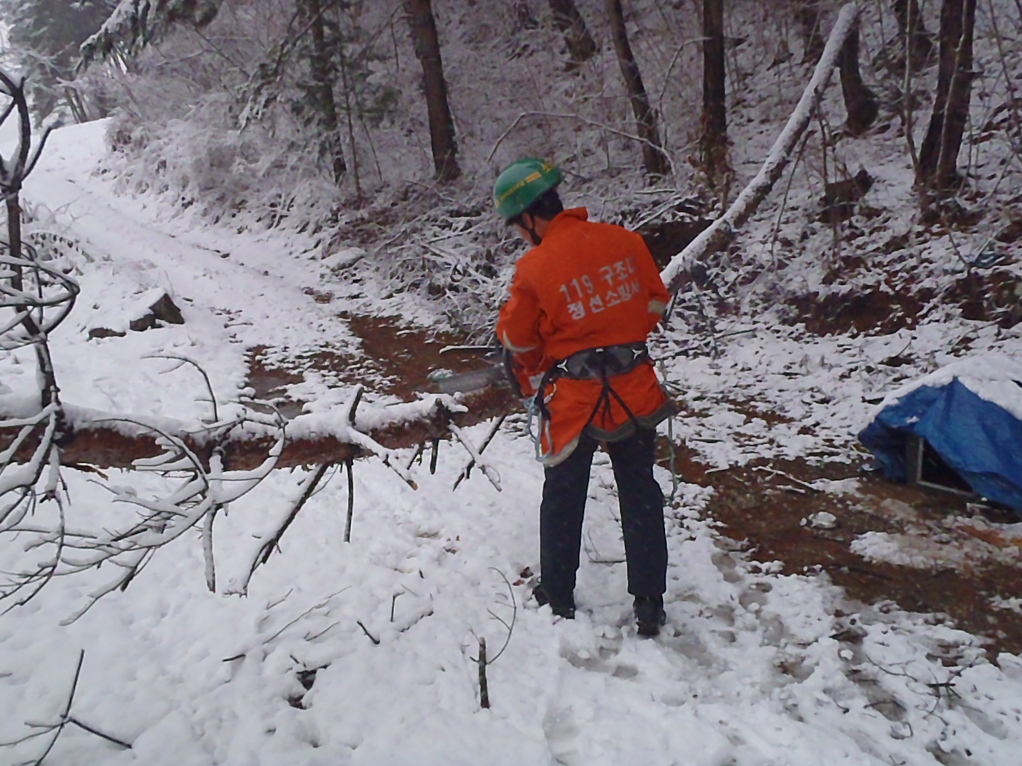 정선소방서(서장 박창진) 119 구조대는 12.1일 오전 임계면 문래리 주택가에 전날 내린 폭설로 인하여 소나무가 쓰러져 지붕을 덮쳤다는 민원신고를 받고 출동했습니다. 현장 도착한바 15M 이상크기의 소나무들이 가지에 많이 쌓인 눈으로 인하여 부러지고 또 많이 휘어져 있어서 2차 3차 위험이 발생할수 있다고 판단이 되어 체인톱 및 크레인 로프를 이용하여 나무절단과 안전조치를 마치고 돌아왔습니다. 하얗게 내린 눈 정말이지 너무나도 아름답고 멋진 풍경을 자랑 하지만 그이면에 숨어 있는 무서움은 그야 말로 주민들을 불안하게 만드는 요소중에 하나라는걸 깨달은 하루였습니다.