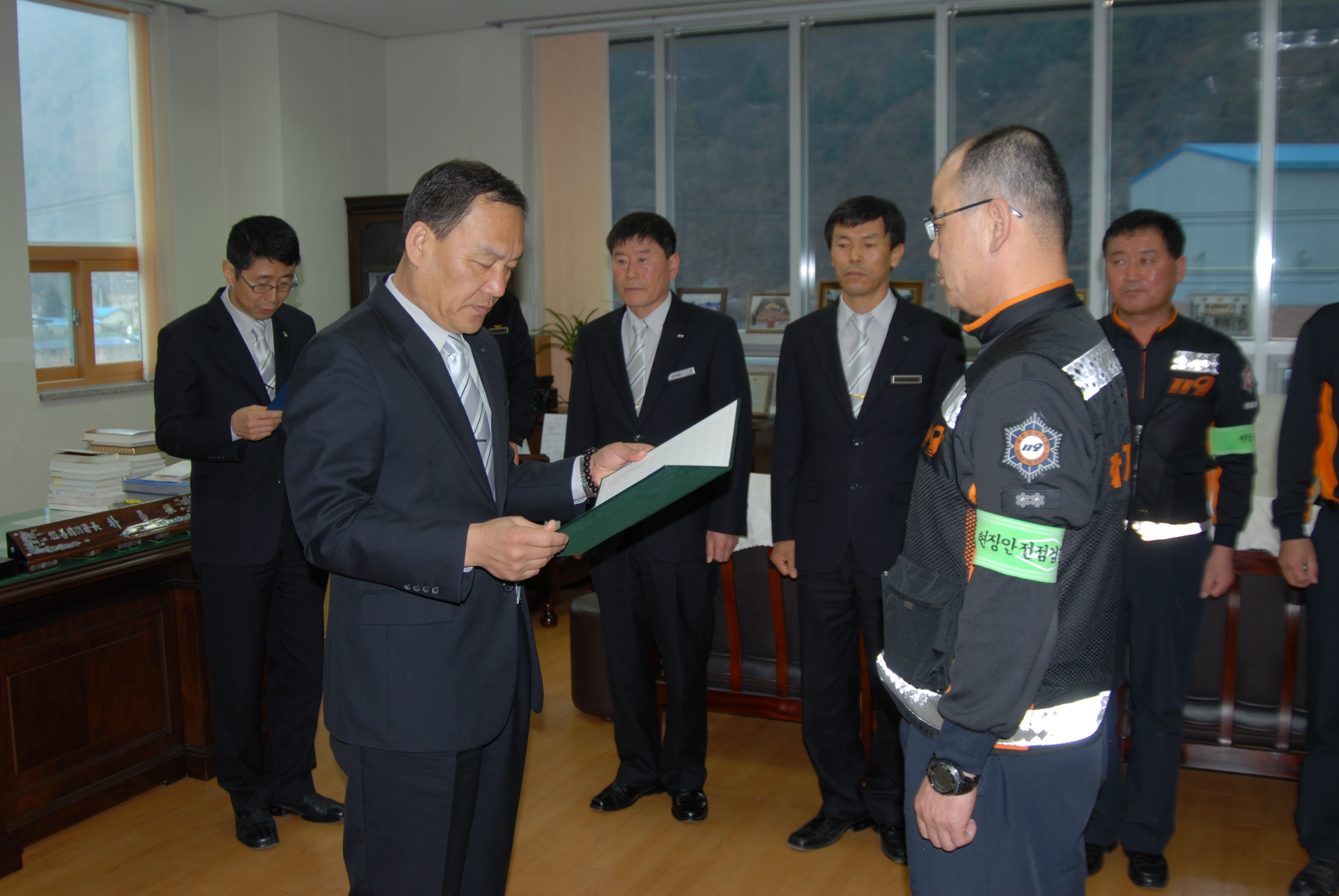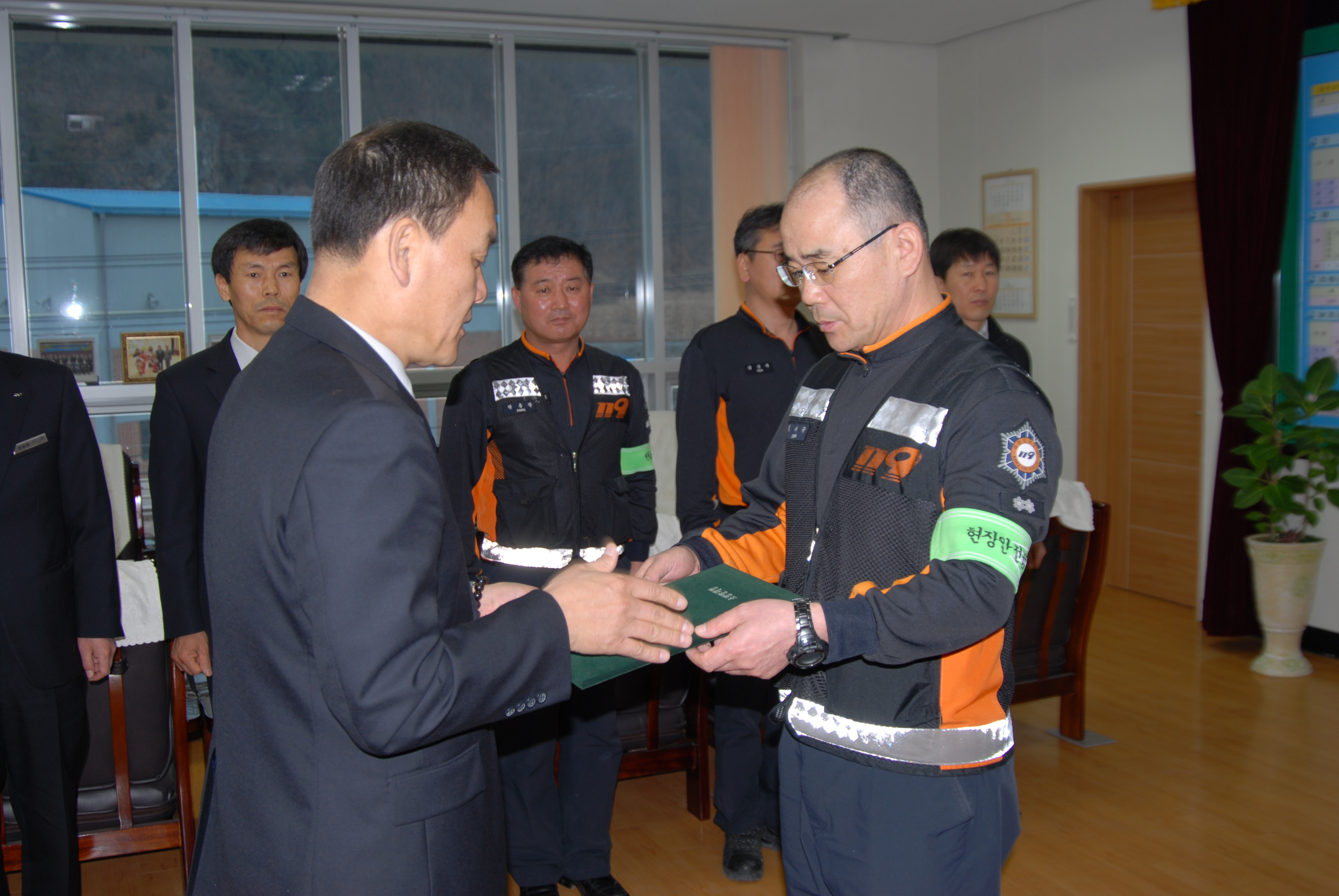 정선소방서(서장 박창진) 3. 09(금) 서장님실에서 2011년 화재와의전쟁 유공자에 대한 표창장 전수를 하였습니다. 이번 화재와의 전쟁 수행 평가는 중상위권을 차지하였으며, 화재와의 전쟁 수행에 힘써주신 직원 여러분의 노고에 감사 드리며, 대표로 수상하신 진압조사팀장(소방경 정의규)님 직원 모두 축하해 주시기 바랍니다.