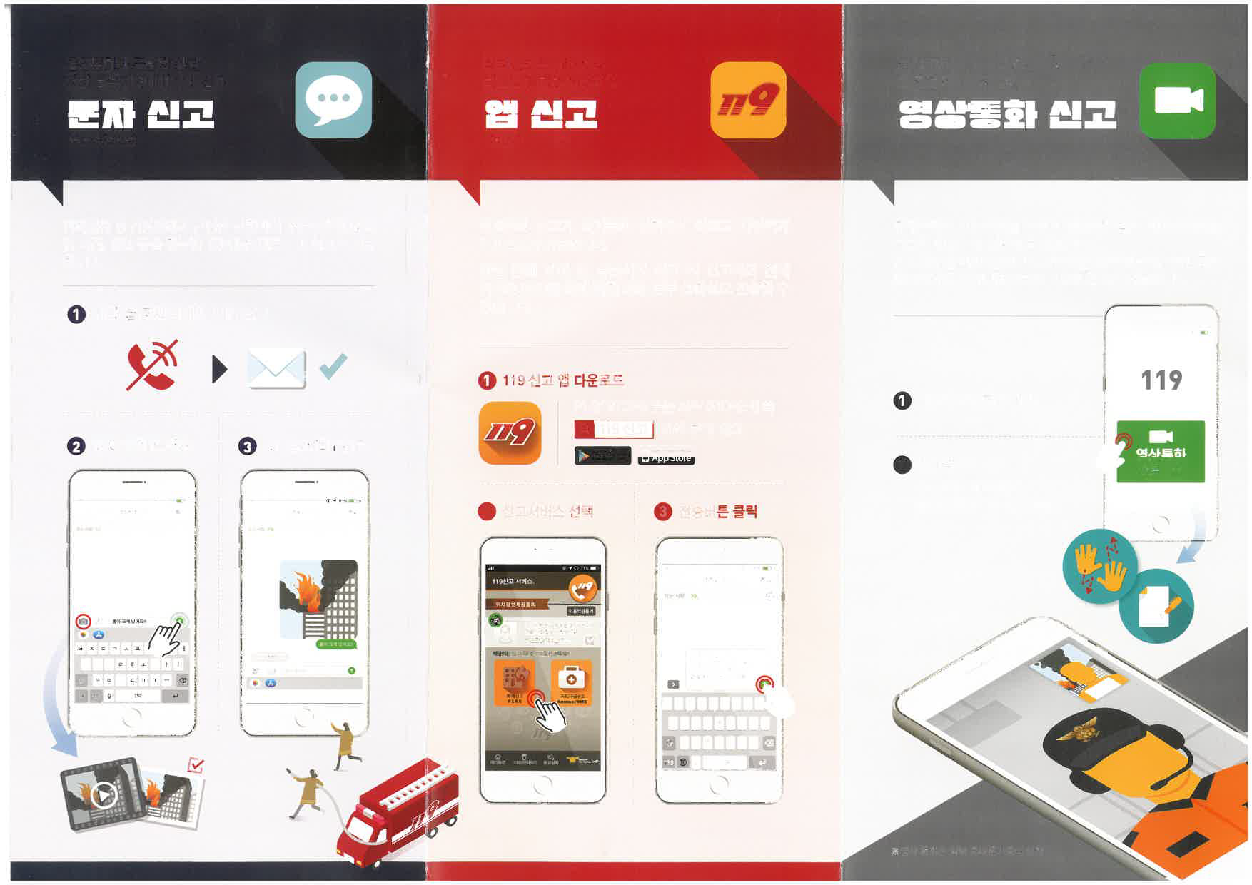문자 신고는 전화 불통 등 음성통화가 곤란한 상황에서 119 번호로 신고 내용을 입력한 후 전송하면 신고가 접수된다. 사진ㆍ영상도 문자로 첨부 가능하다.