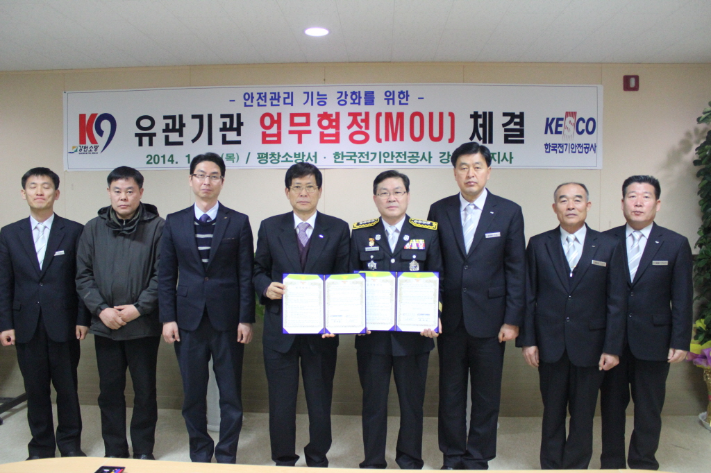 ◇ 평창소방서(서장 김남숙)는 2014. 1. 23(목) 11시 평창소방서 소회의실에서 한국전기안전공사 강원동부지사와 화재로 인한 인명피해를 줄이고 전기안전문화 정착을 위하여 업무협약(MOU)을 체결하였다.