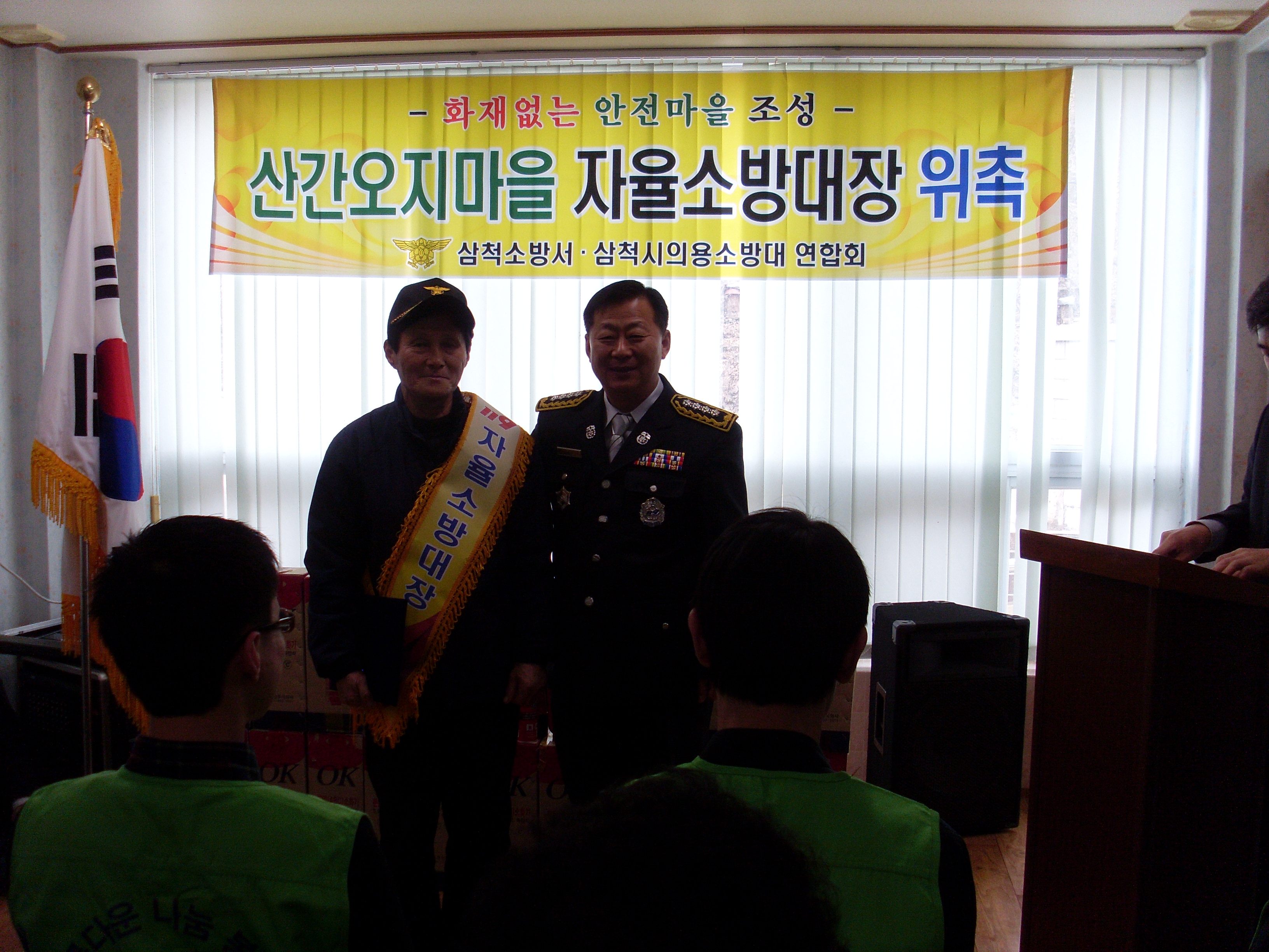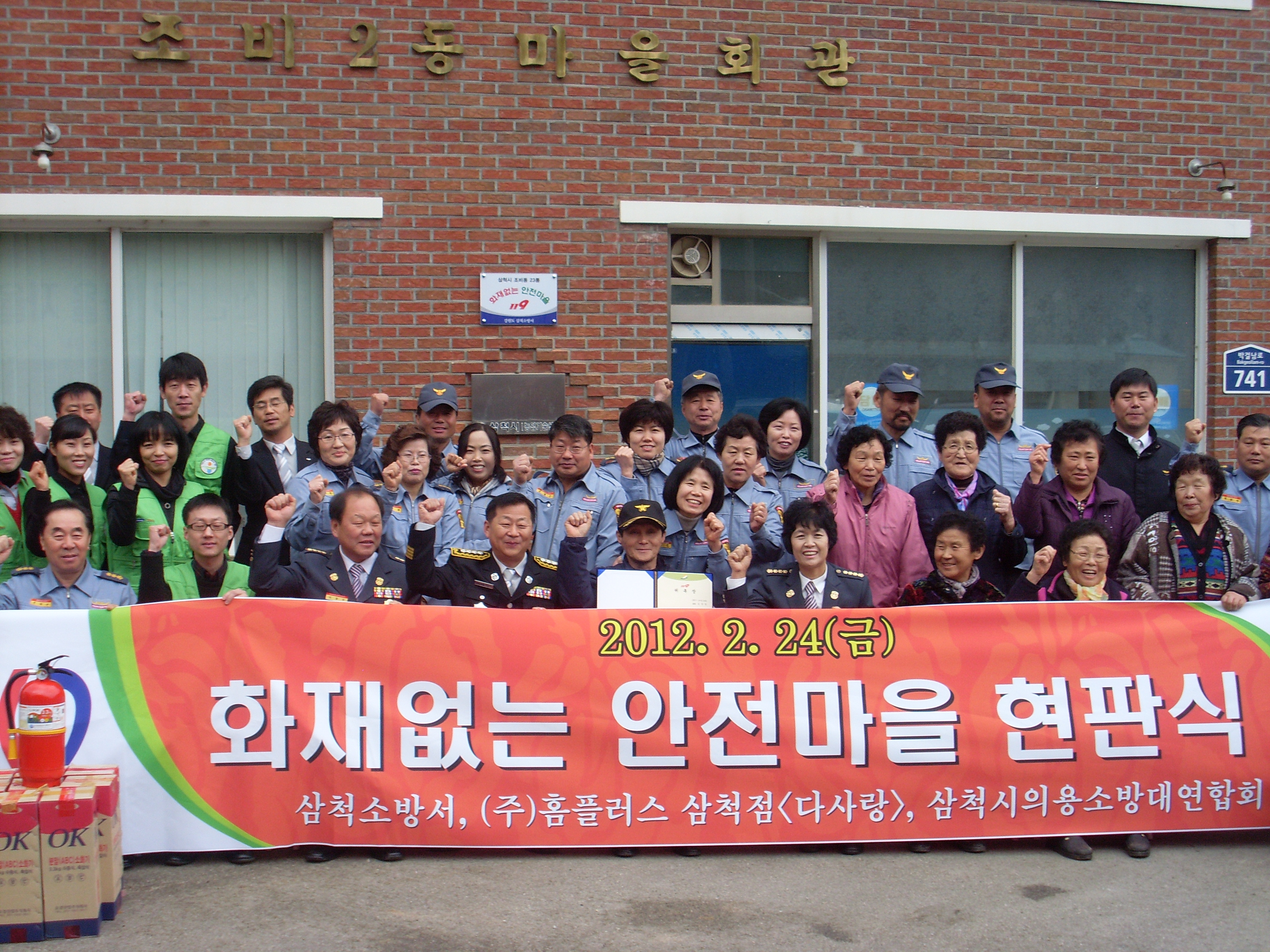 2012년 2월 24일 삼척대에서 자매결연맺은 조비동 산간오지 마을 자율 소방대장 위촉식 및 화재없는 안전마을 현판식에 대장(최금순)과 대원들 참여, 홈플러스 다사랑 봉사팀에서 소화기 20개 기증해주심에 감사드림니다.