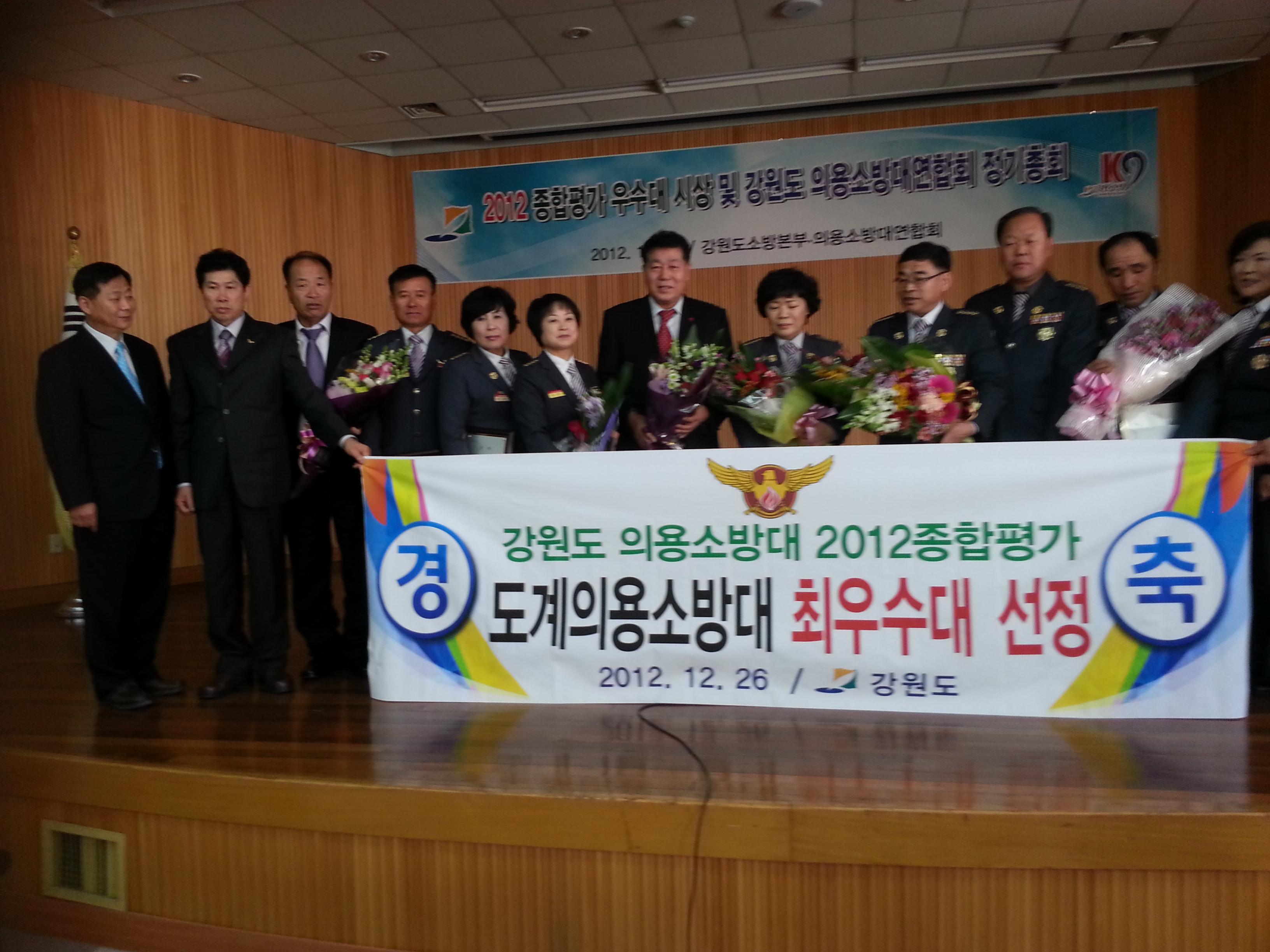 도 소방본부(본부장:오대희)는 26일 춘천소방서 대회의실에서 `2012년 우수 강원도 의용소방대 시상식 및 정기총회'를 열고 삼척 도계의용소방대, 원주 흥업여성대, 간성의용소방대 장신지역대 등을 최우수 의용소방대로 선정해 표창장을 전달했다. |