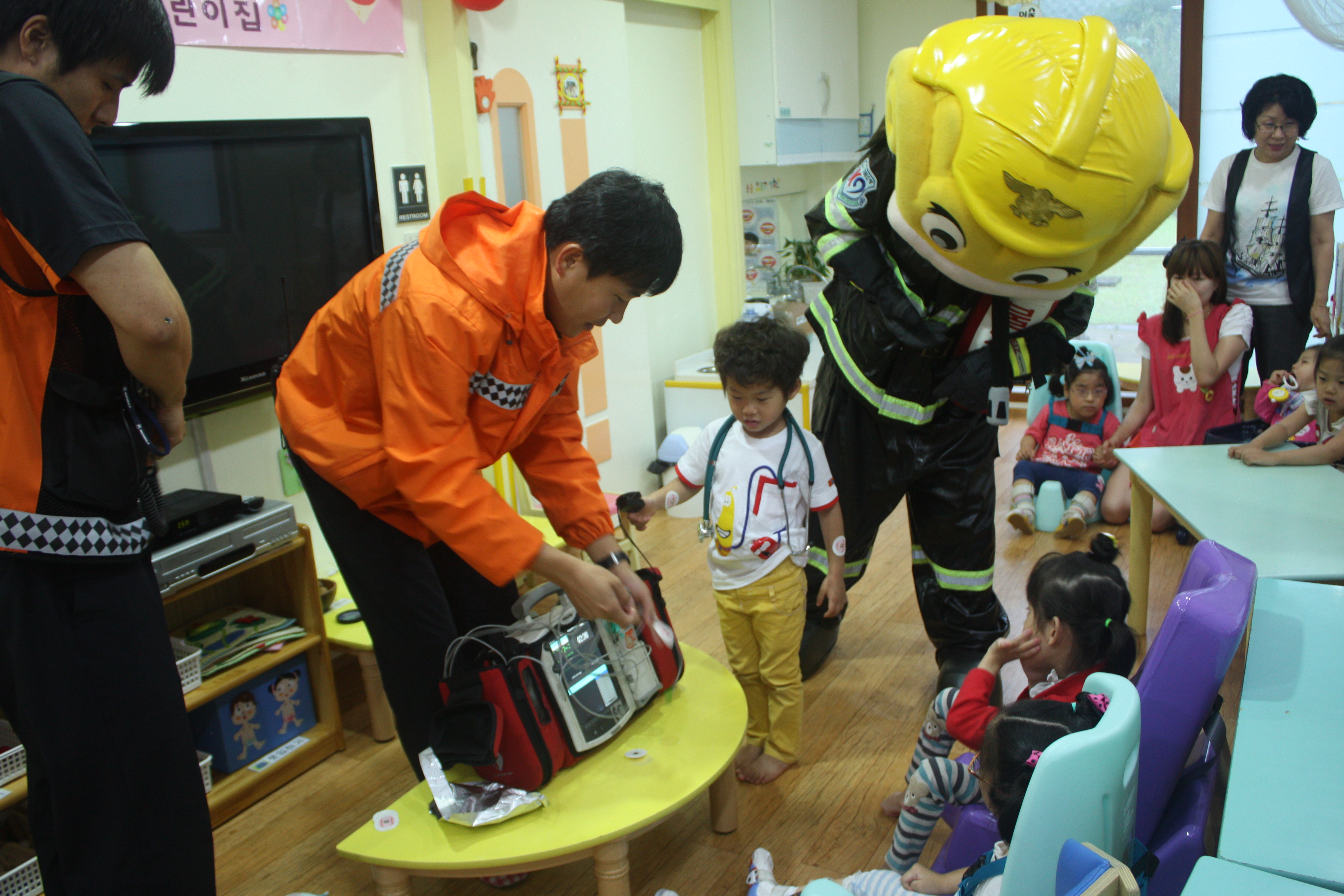소방캐릭터 탈을 쓴 소방대원이~ 소화기 사용법과 물놀이 안전놀이규칙, 생활안전규칙을 설명하고~ 구급대원은 제세동기 사용법을 친절히 설명해 주었습니다.