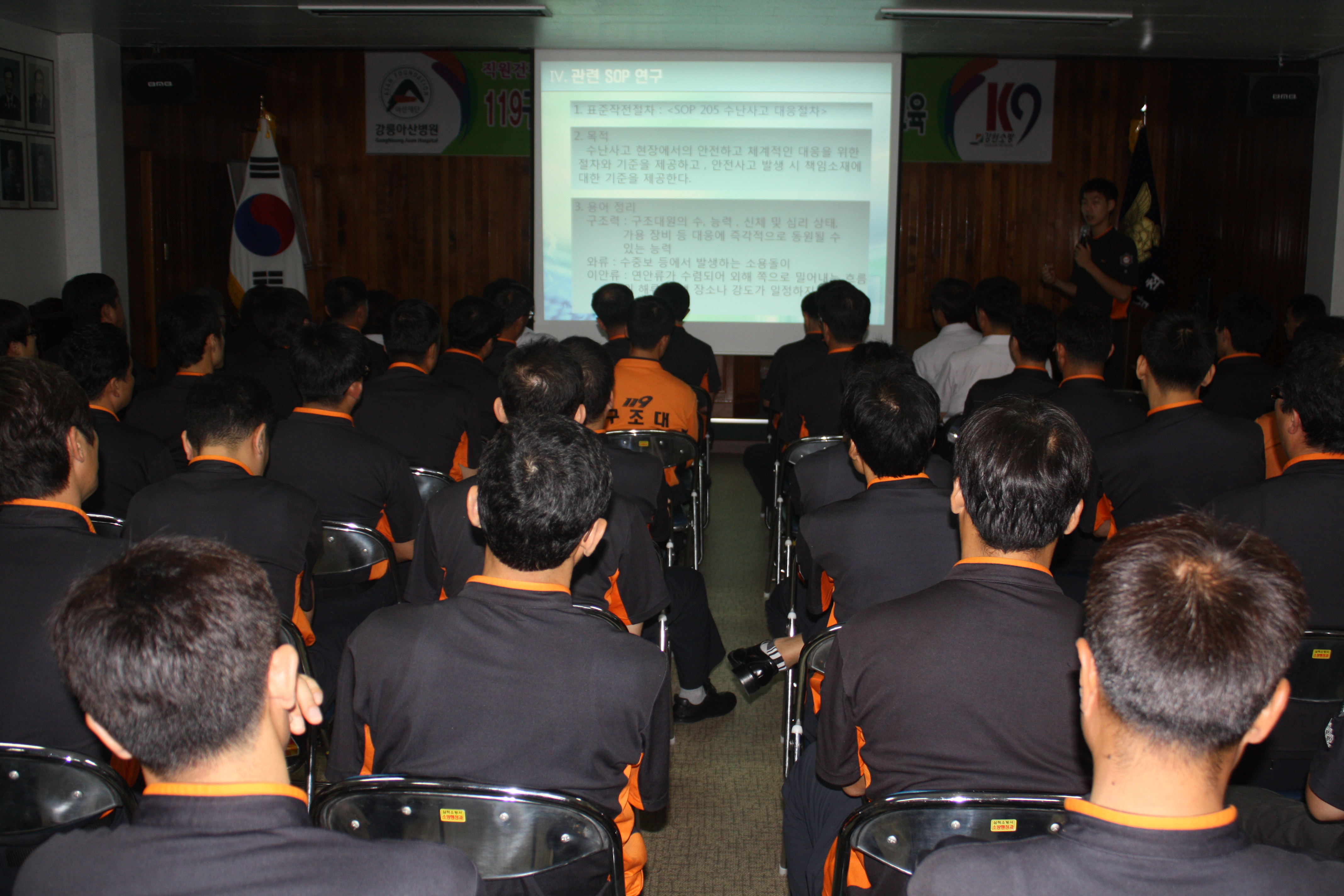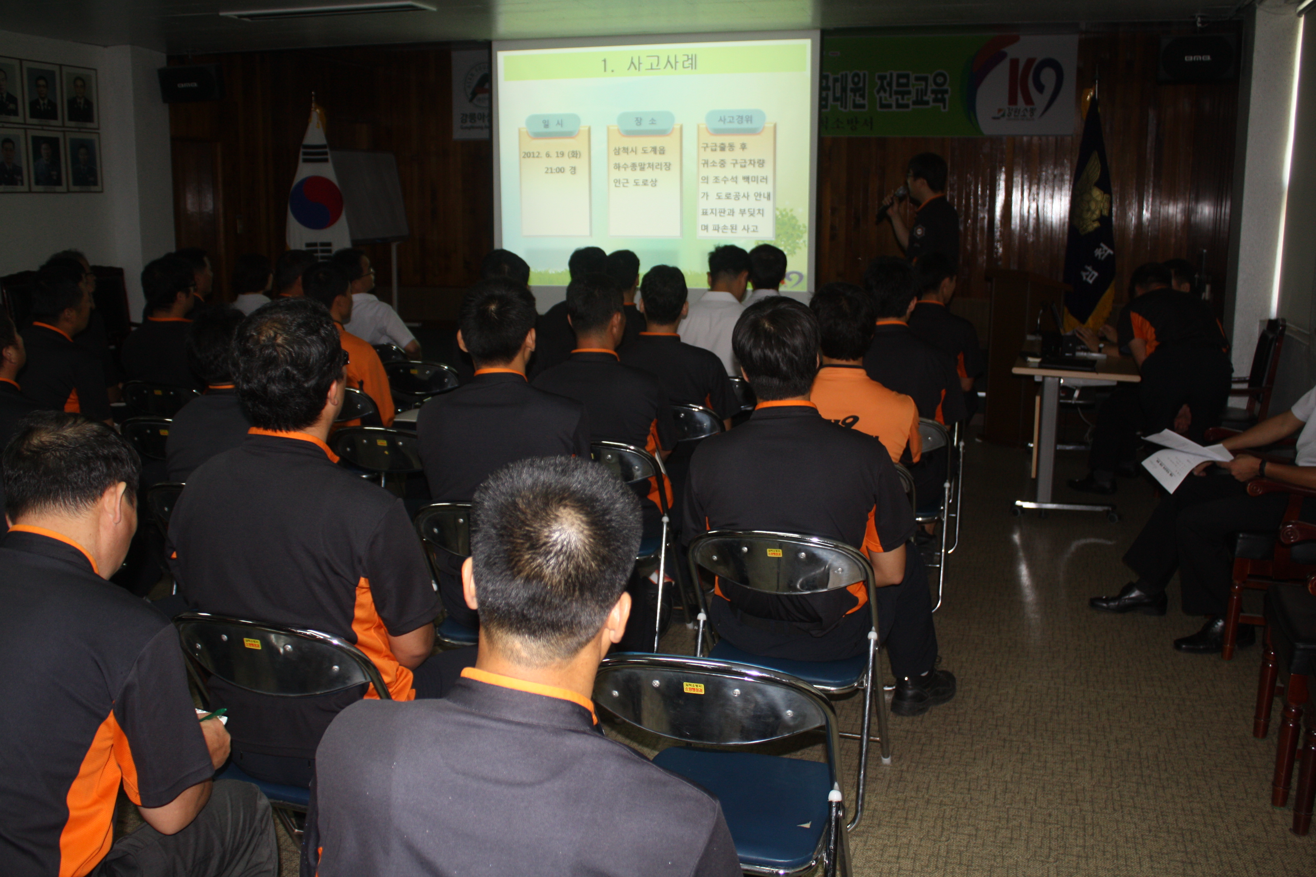 2012년 8월 6일 09시 대회의실에서 소방공무원80여명을 대상으로 소방활동 안전사고 방지를 위한 특별교육을 실시하였다.