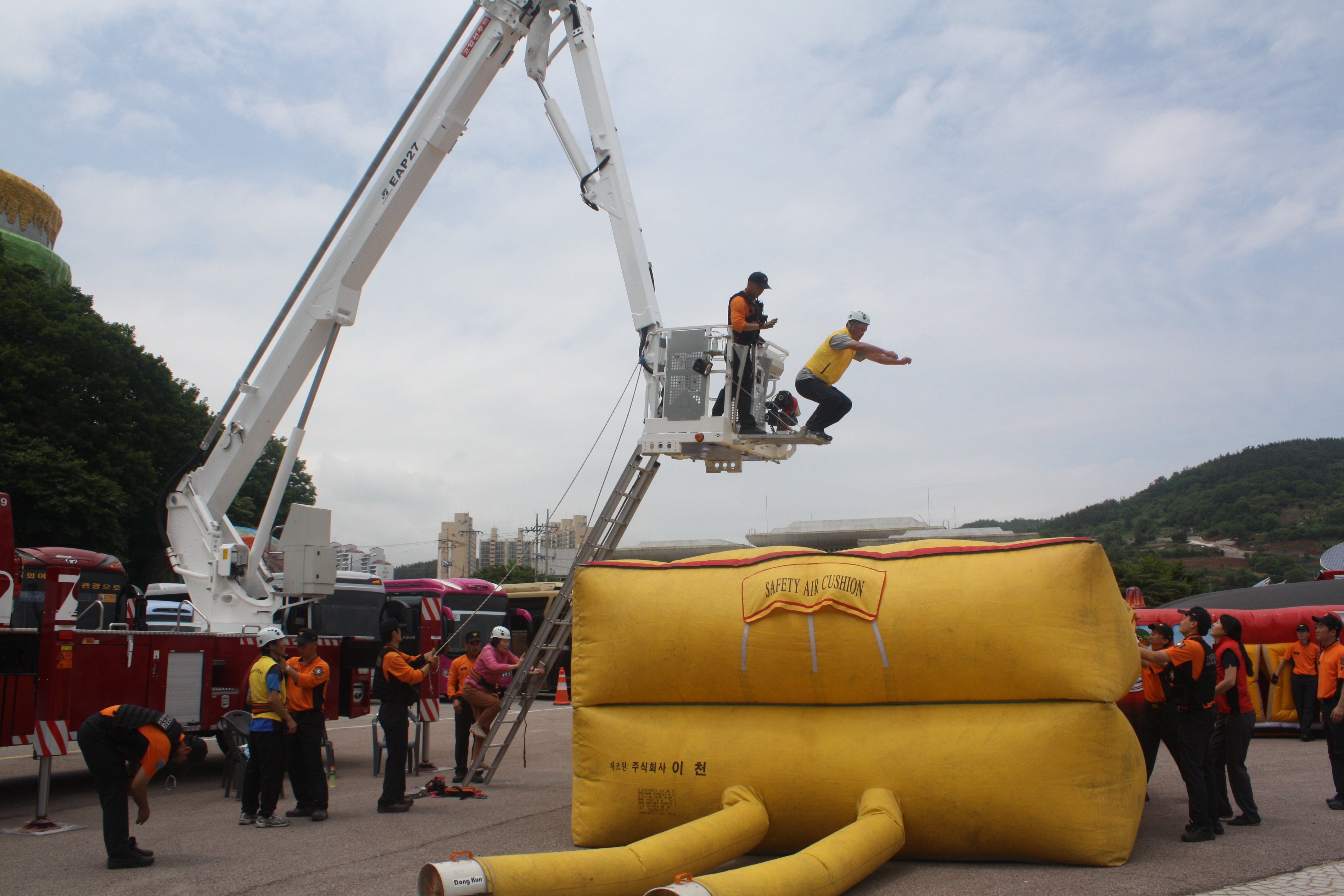 소방안전체험장에서는 ▲ 물소화기 체험 및 소화기 사용법 교육 ▲ 굴절차에서 안전매트로 탈출 ▲ 연기체험바운스 체험 및 화재시 대비법 교육 ▲ 심폐소생술 (CPR)교육 및 체험 ▲ 소방안전작품 및 구조장비 전시 등을 실시하였다.