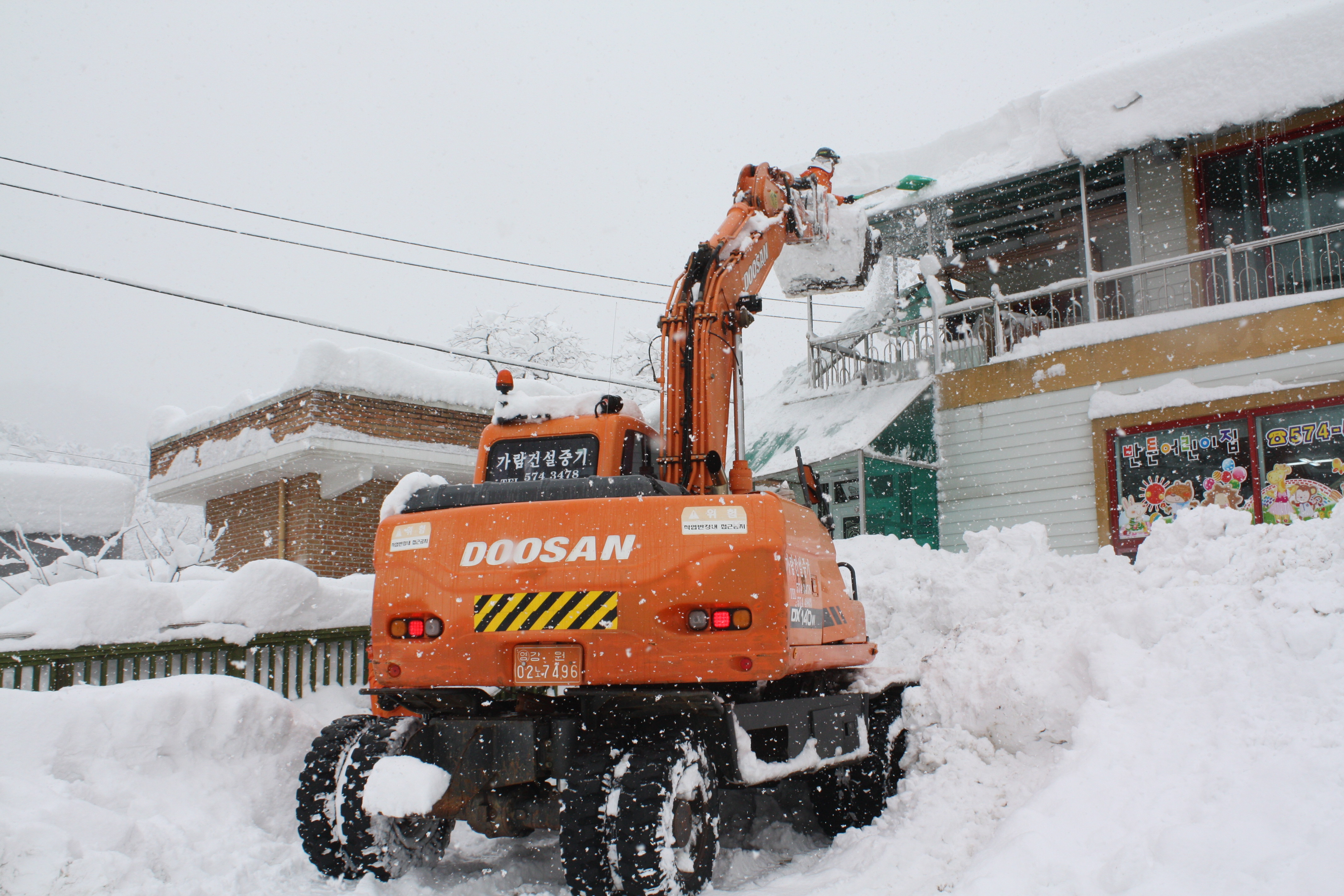 2014. 2.10 삼척 펌프(위 김진욱 외 2명)는 폭설로 반튼어린이집 빗물 막이 지붕이 휘어지면서 붕괴 되려고 한다는 신고를 받고 출동하여 사다리를 이용하여 제설작업을 실시하려고 하였으나 쌓인 눈 때문에 어려워지자 제설작업을 하던 의용소방대원의 도움으로 포크레인 위에 올라 지붕 제설작업을 실시하였다.