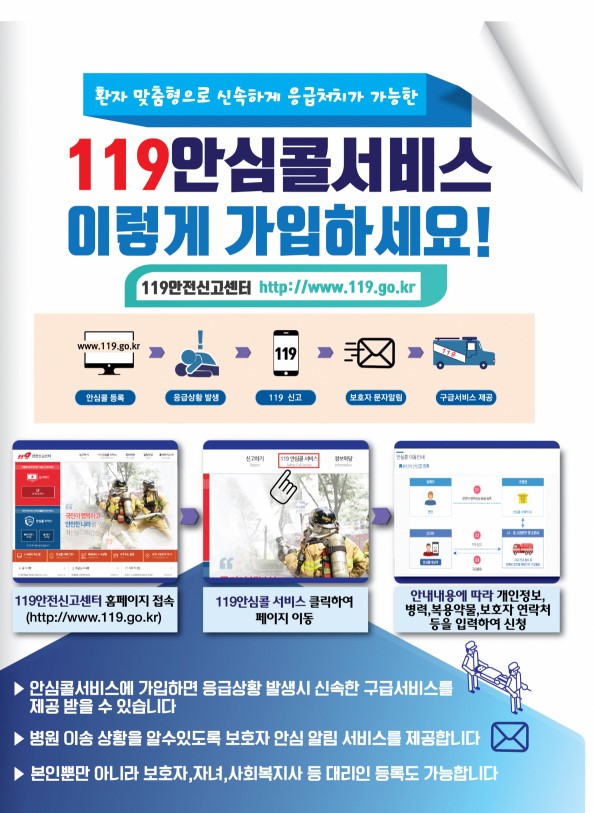 119안심콜 서비스는 응급상황 발생 시 119로 신고하면 사전 등록된 신고자(환자)의 병력과 위치를 파악해 신속한 현장응급처치와 병원 이송을 가능하게 하는 소방 시스템이다.