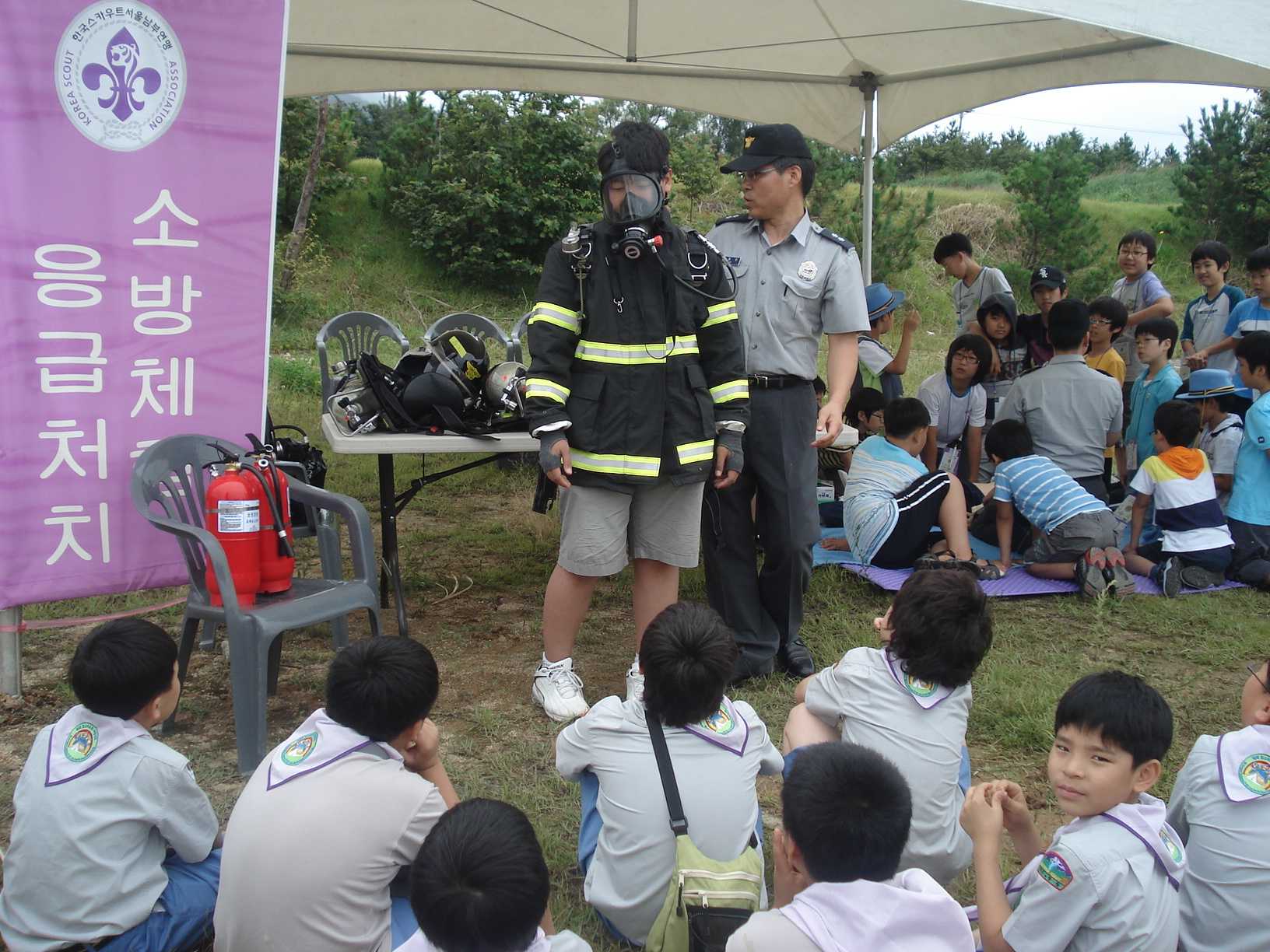 야영생활을 통하여 호연지기와 자립심을 키우고, 새로운 친구들과 즐기면서 배려할 수 있는 마음을 키우기위해 마련된 이 자리에서 대원들에게 좀 더 가까이 소방관 생활을 느껴볼 수 기회를 제공하고자 공기호흡기 및 소방관 복장을 입어보는 자리를 마련하였다. 또한 초기진화의 중요성을 각인시켜 소화기 사용법 및 응급상황에 대처하기위한 심폐소생술 실습 등도 실시하였다.