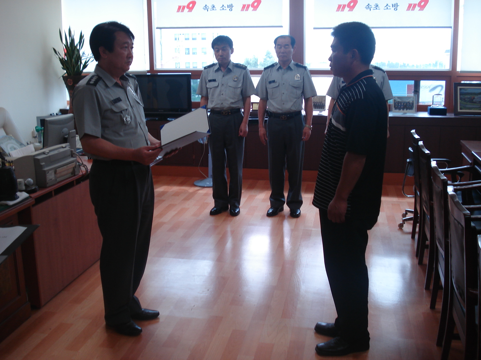 속초소방서(서장 김시균)는 2009. 8. 3(월) 10:00 속초소방서 서장실에서 지난 7. 11(토) 07:25경 속초시 조양동 1470번지 소재 상가주택지역에서 발생한 화재를 초기진화하여 소중한 인명과 재산을 보호한 이영규(43세)씨에게 유공자 표창을 전수하였다.